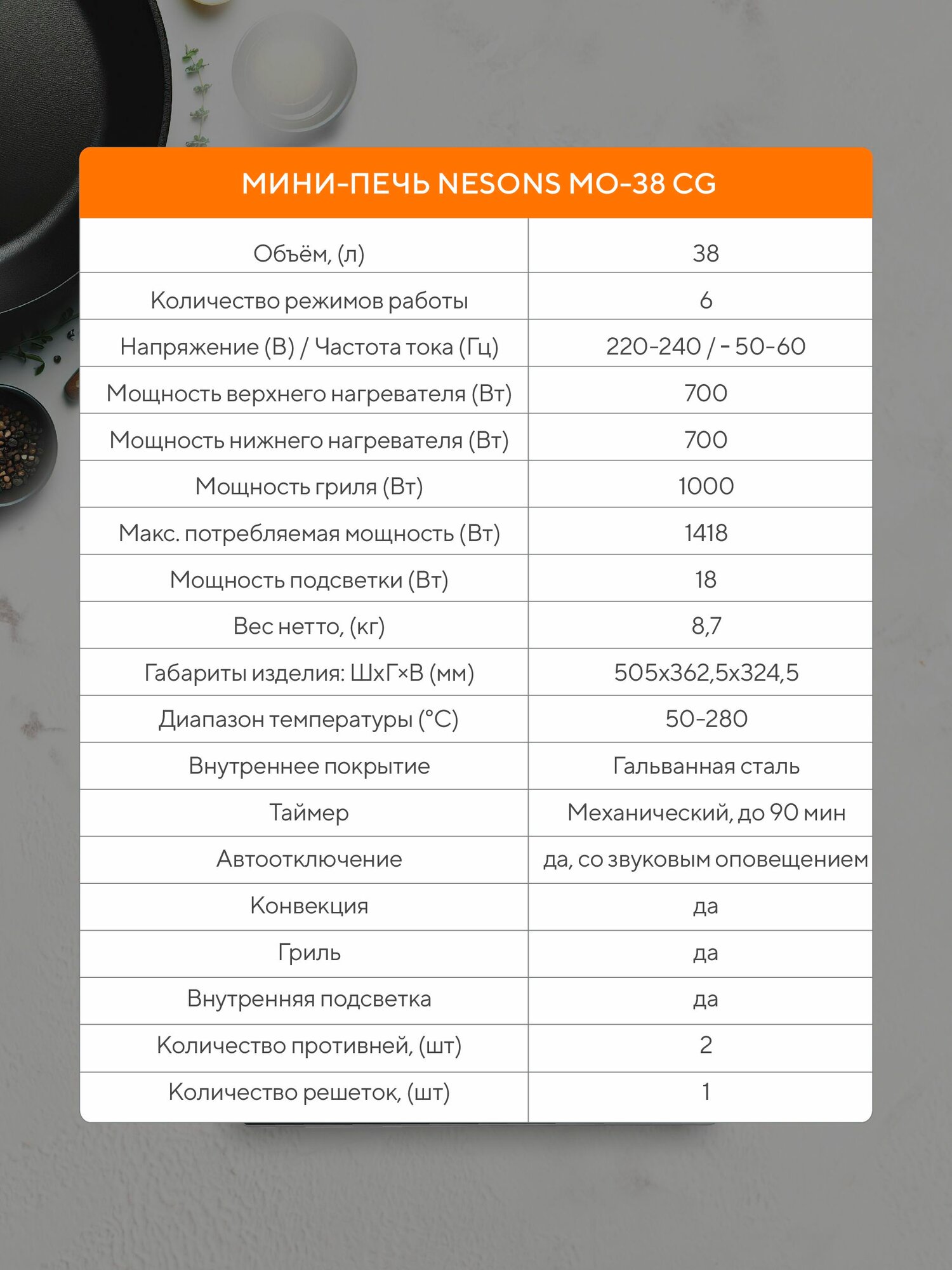 Мини печь с грилем 38 л духовка электрическая настольная серая Nesons интересное: