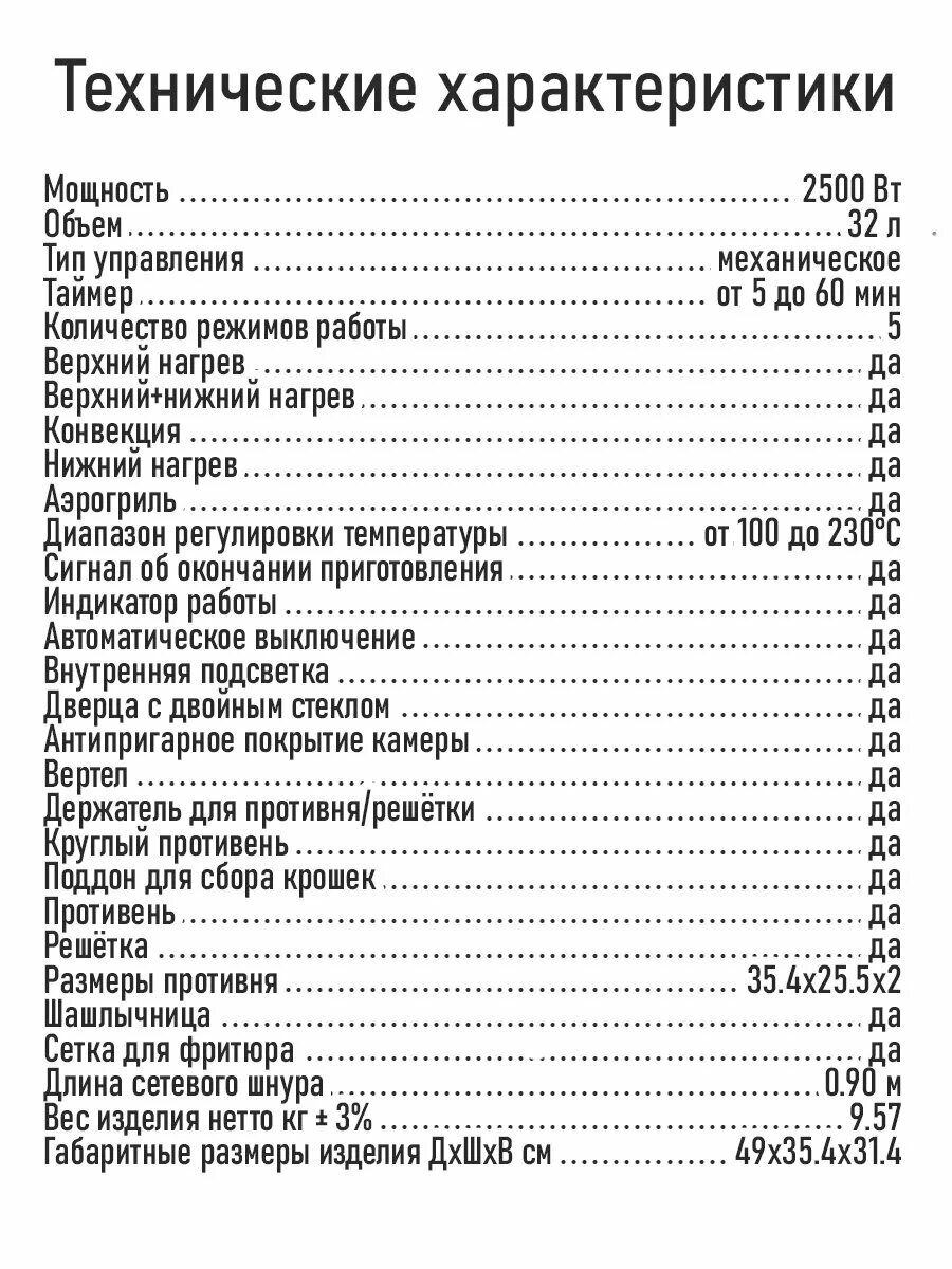 | Режимы работы | верхний нагрев, конвекция, нижний нагрев |