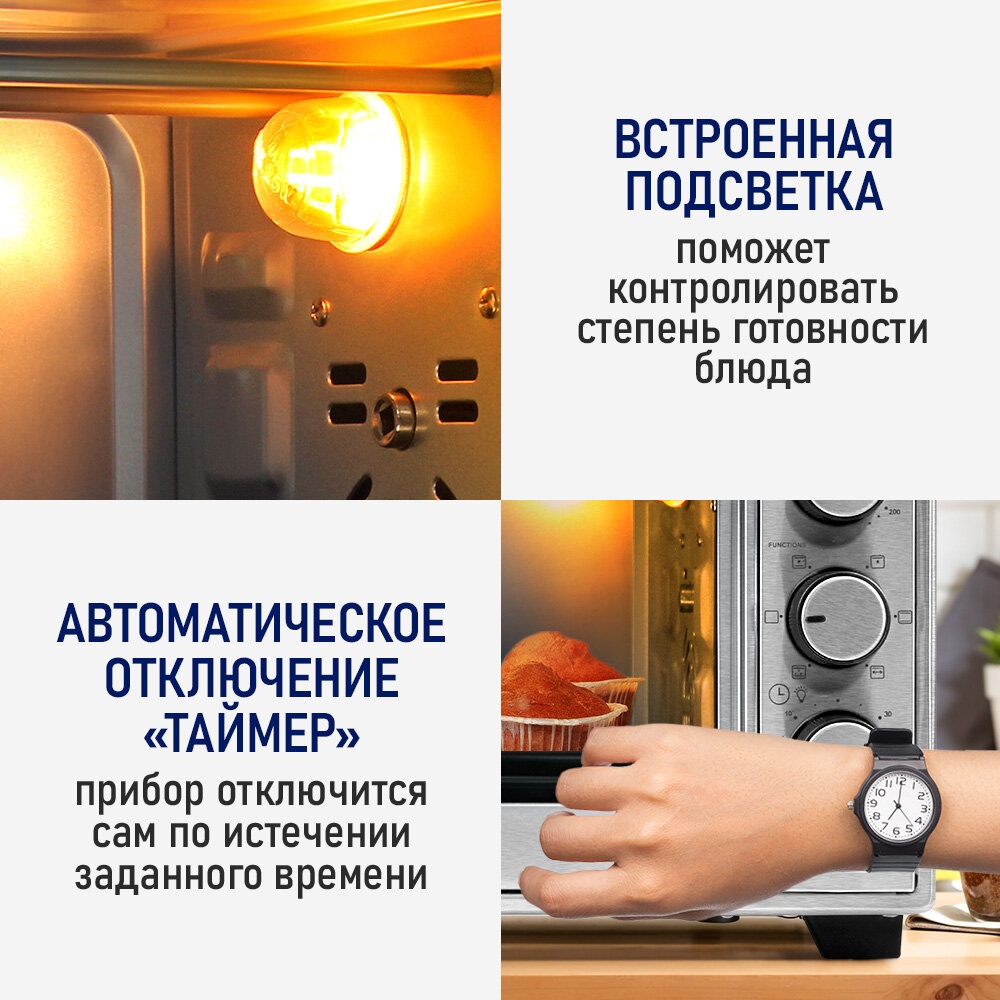 | Доп. опции мини-печи | Паровое увлажнение, автоматическое отключение, сигнал о готовности |