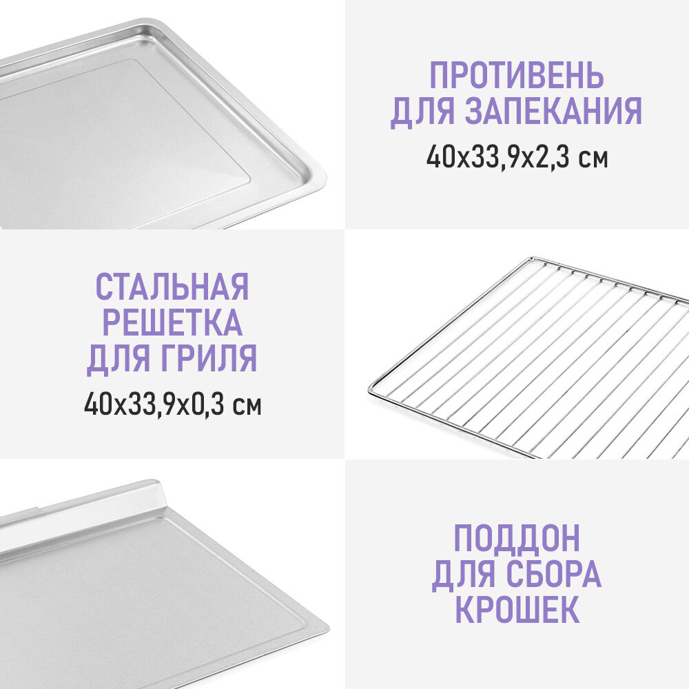 | В комплекте | держатель для противня/решётки, поддон для сбора крошек, противень, решётка |
