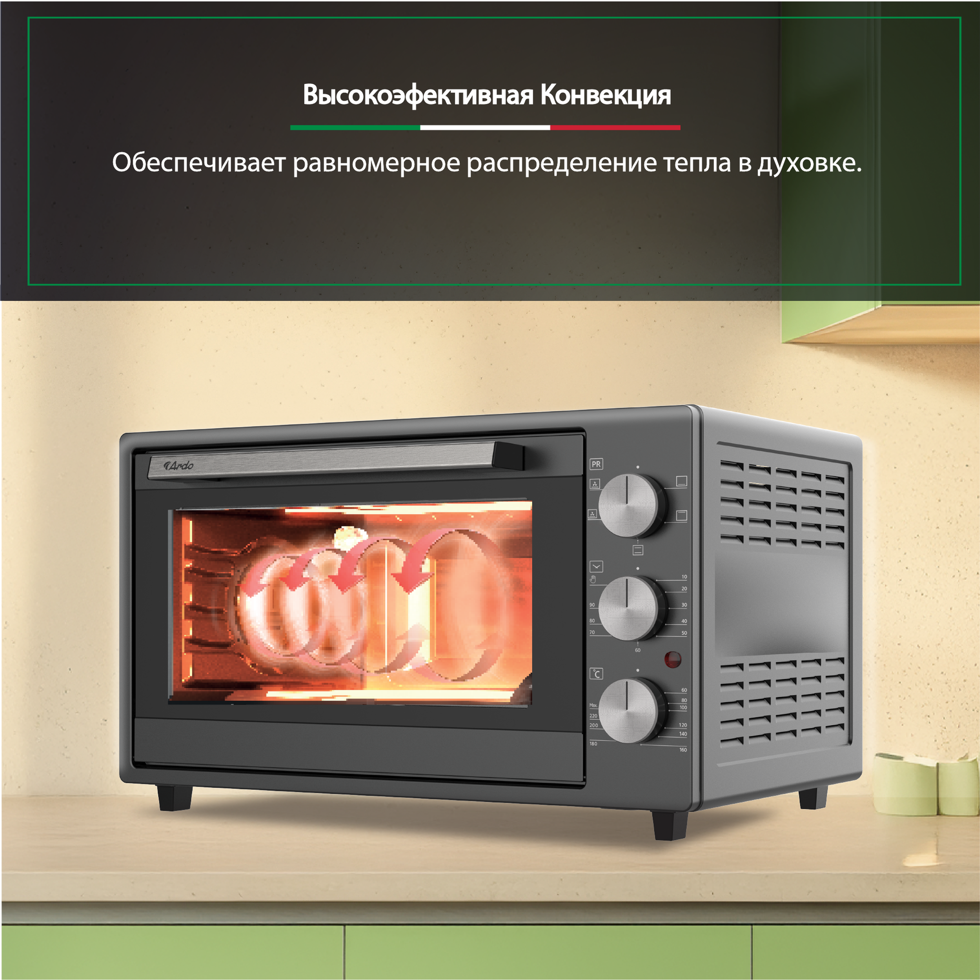 Мини-печь Ardo 5 режим, конвекция, 38 л, 2 противня +решетка, турбовентилятор, двойное стекло дверцы, таймер интересное: