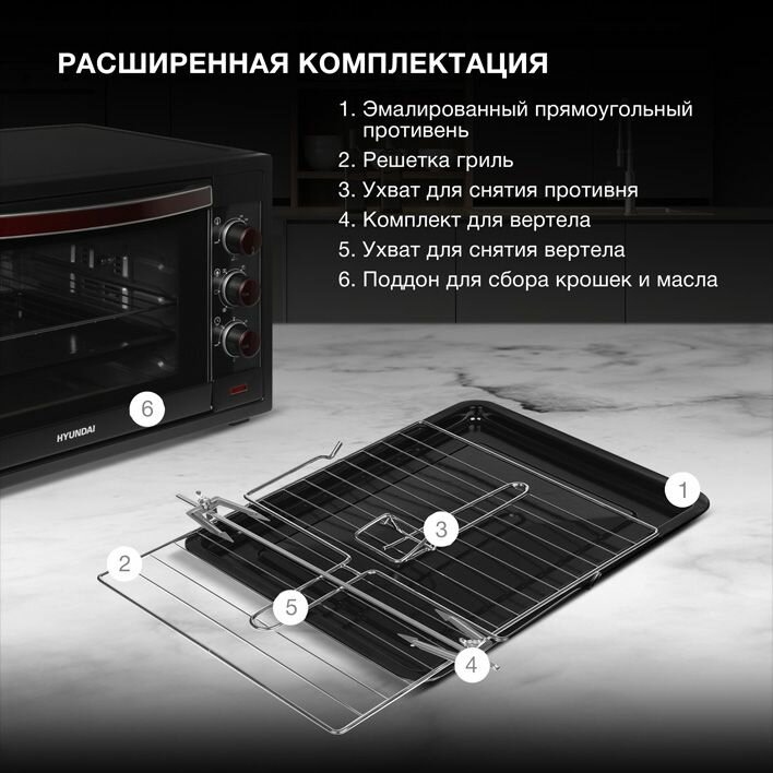 Мини-печь электрическая Hyundai MIO-HY102, черный, объем духовки 50 л, мощность 2000 Вт, 6 режимов работы с температурой от 100 до 250 С интересное: