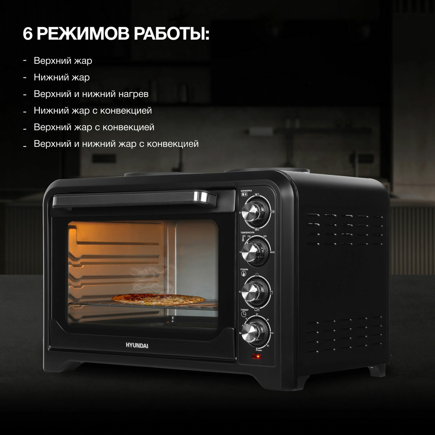 Мини-печь Hyundai MIO-HY095 45 л, 2000 Вт, черный