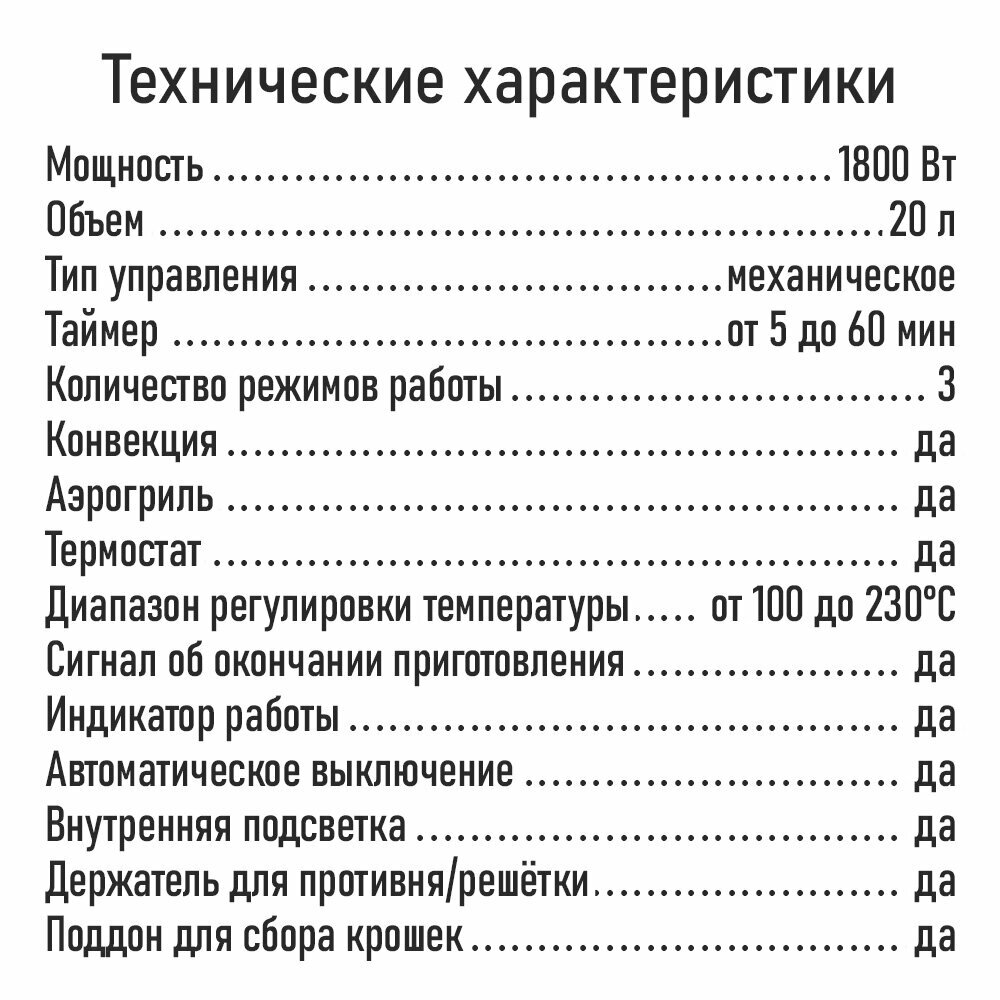 | Доп. опции мини-печи | индикация включения, сигнал о готовности, таймер |