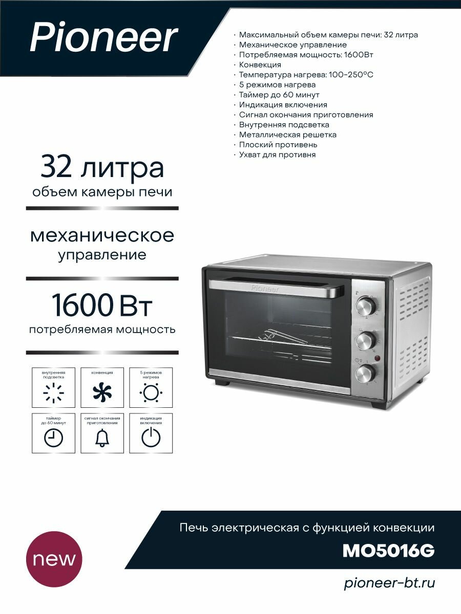Мини-печь электрическая 32л с КОНВЕКЦИЕЙ Pioneer MO5016G, 5 режимов нагрева, подсветка внутри, таймер до 60 мин, 1600 Вт интересное: