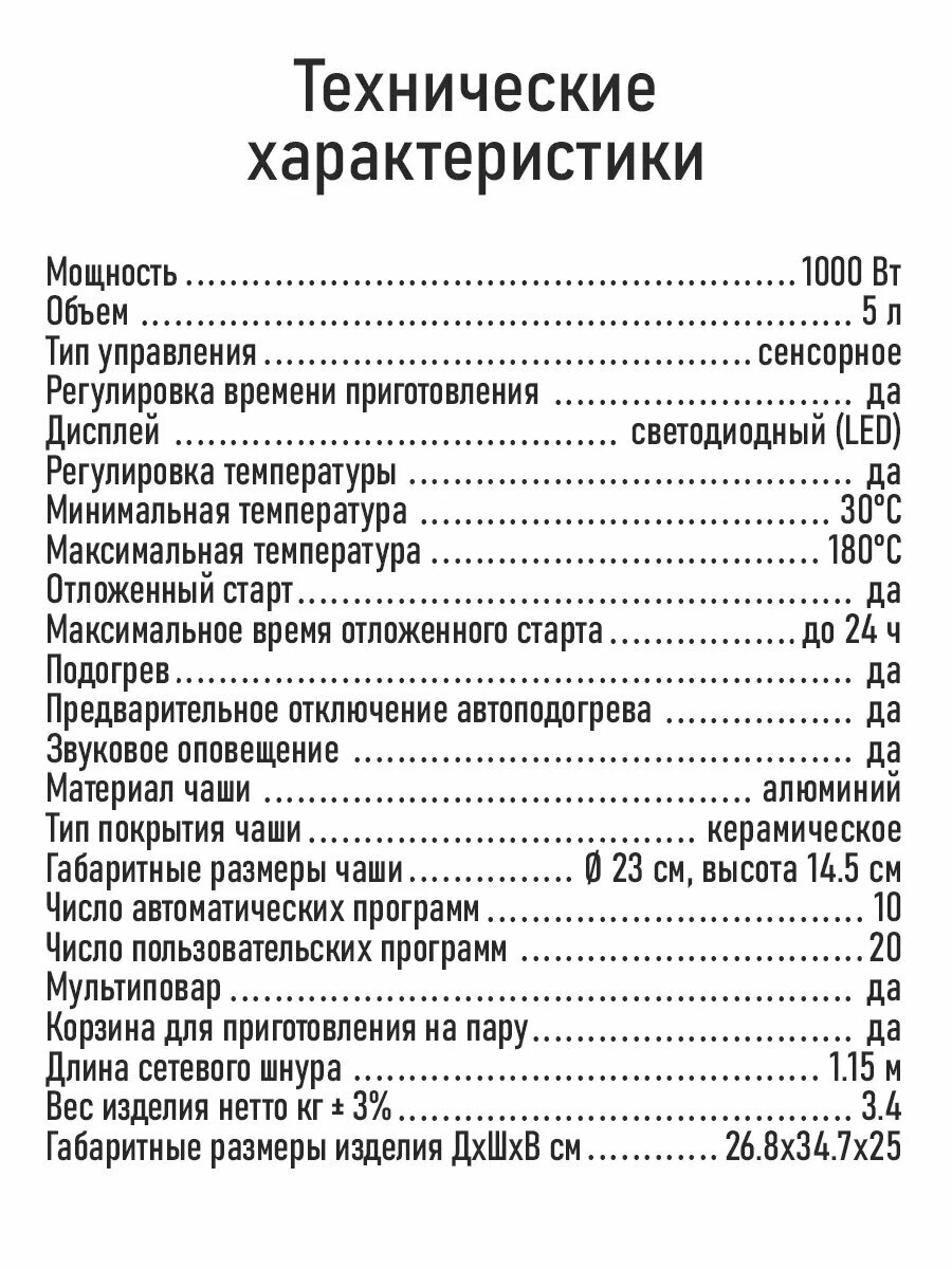 | Программы | варка, запекание, суп, тушение |