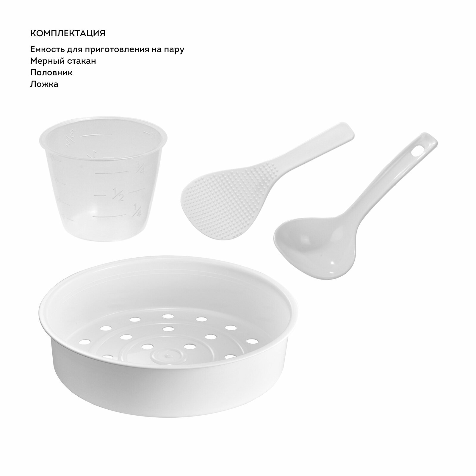 | Подробная комплектация | Мультиварка 1 шт. Съемная чаша 1 шт. Ложка 1 шт. Мерный стакан 1 шт. Емкость для приготовления на пару 1 шт. Половник 1 шт. Держатель для ложек 1 шт. Внешний контейнер для сбора конденсата 1 шт. Съёмный контейнер для сбора конденсата 1 шт. Шнур питания 1 шт. Книга рецептов 1 шт. Руководство по эксплуатации 1 шт. Потребительская тара 1 шт |