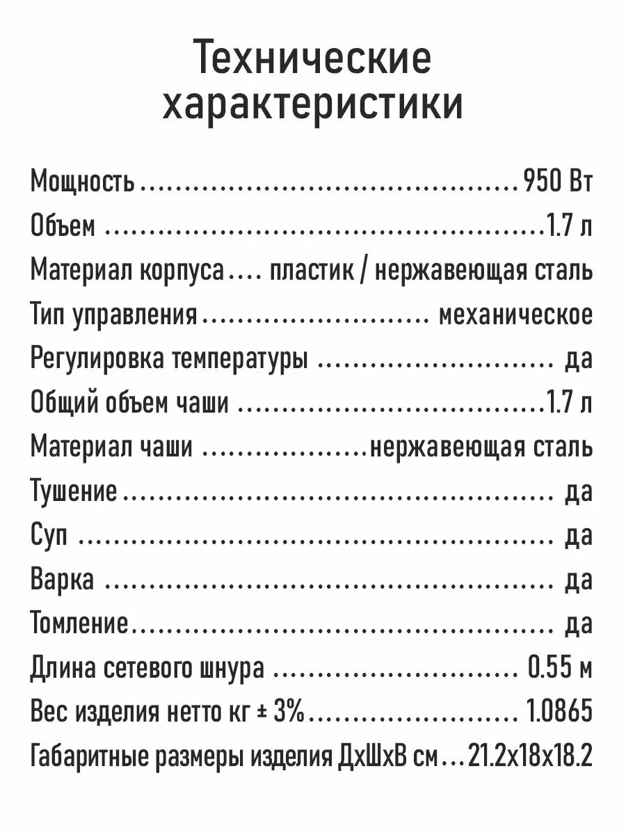 | Программы | варка, суп, тушение, поддержание тепла |