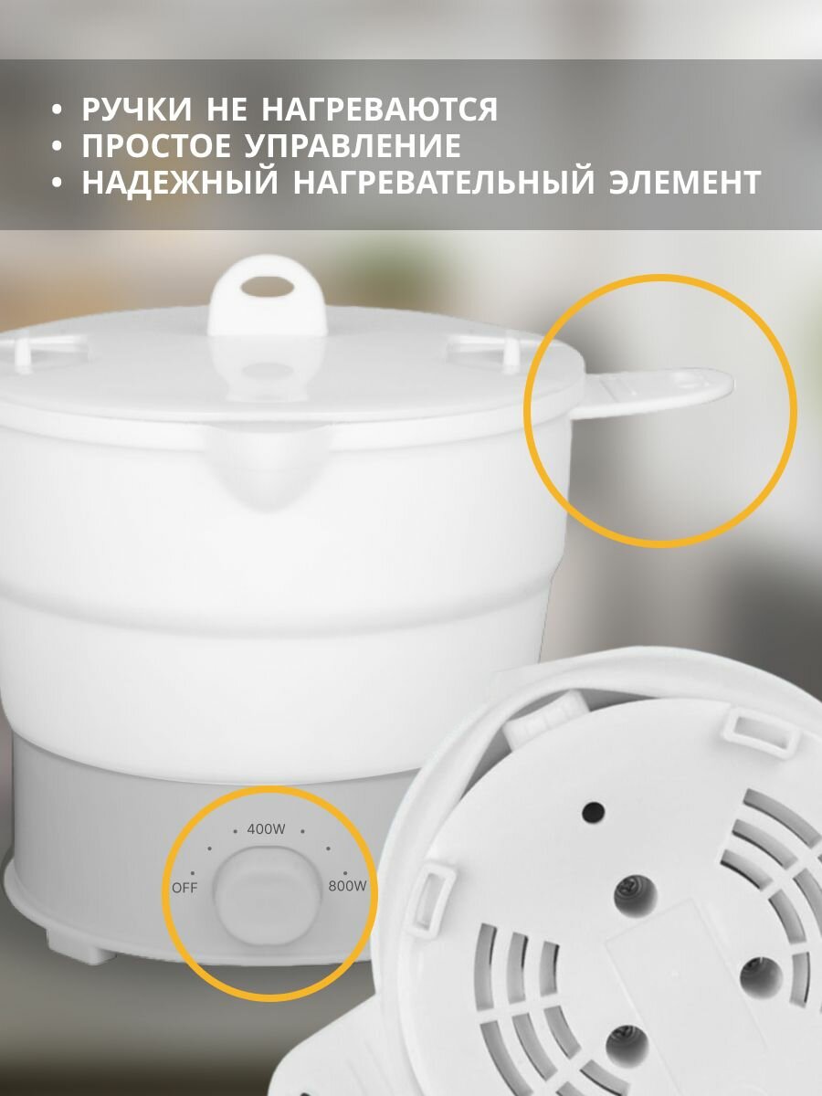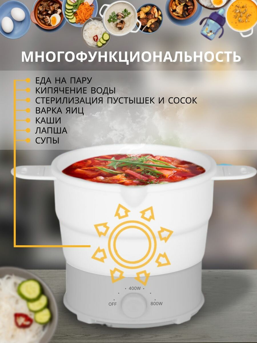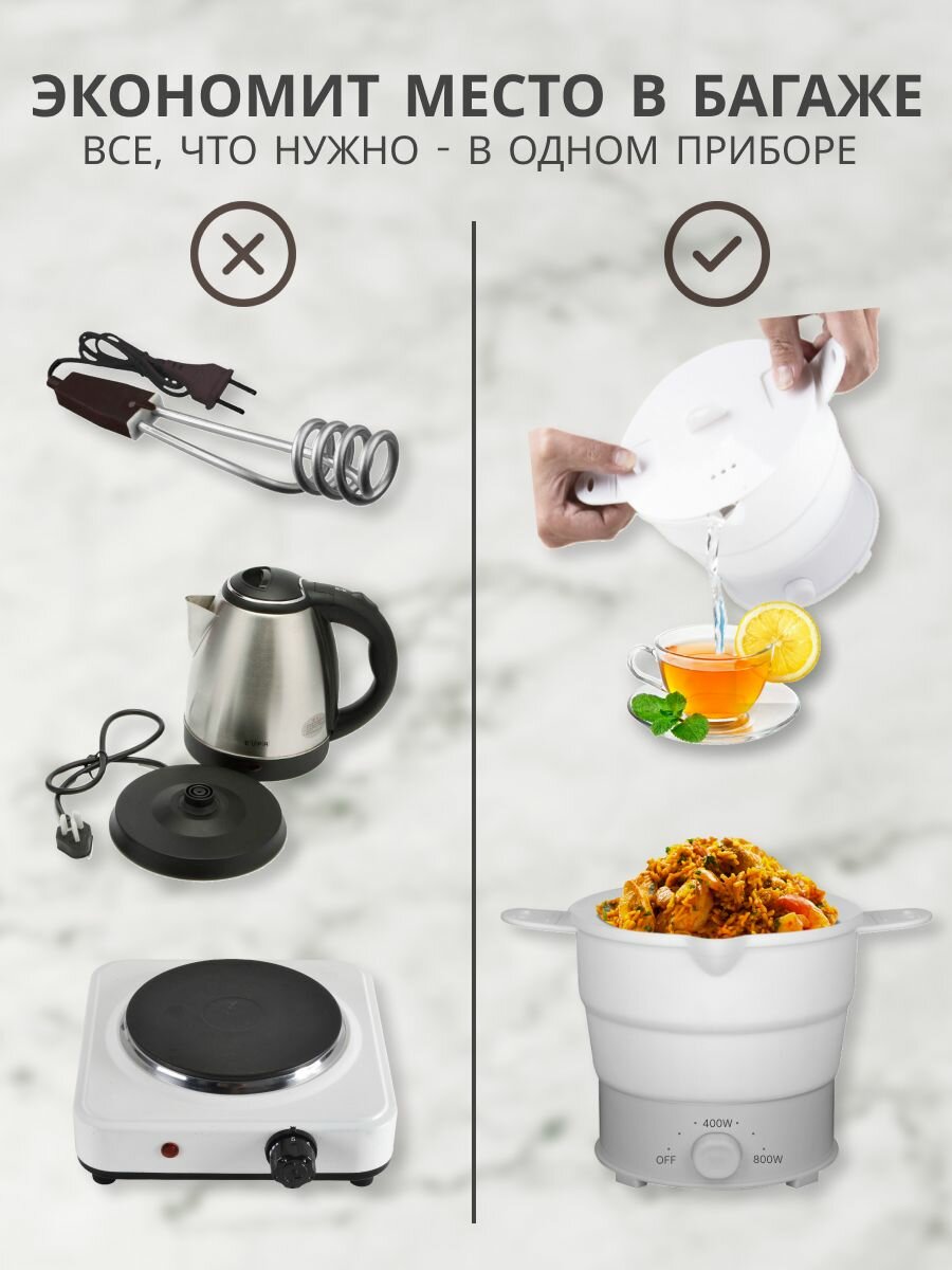 | Подробная комплектация | Складная кастрюля - 1шт; кабель питания - 1шт; крышка - 1шт; насадка для приготовления на пару - 1шт |