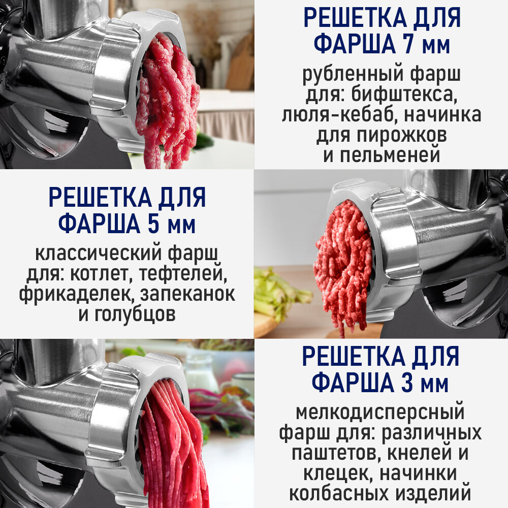 | Насадки | насадка для кеббе / насадка для нарезки печенья / насадка для приготовления колбас |
