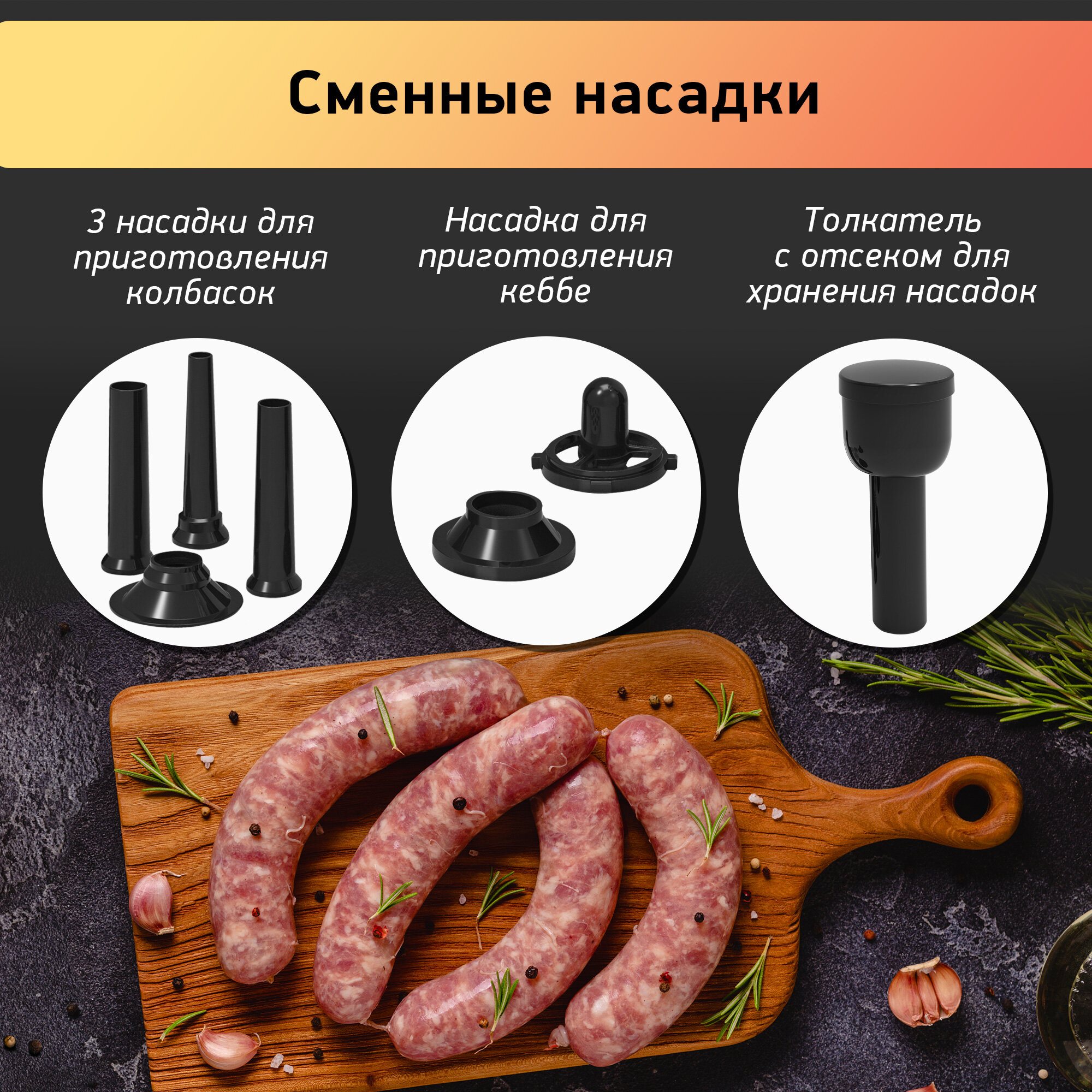 | Насадки | насадка для кеббе / диск для фарша - 3 шт. / насадка для приготовления колбасок - 3 шт. |