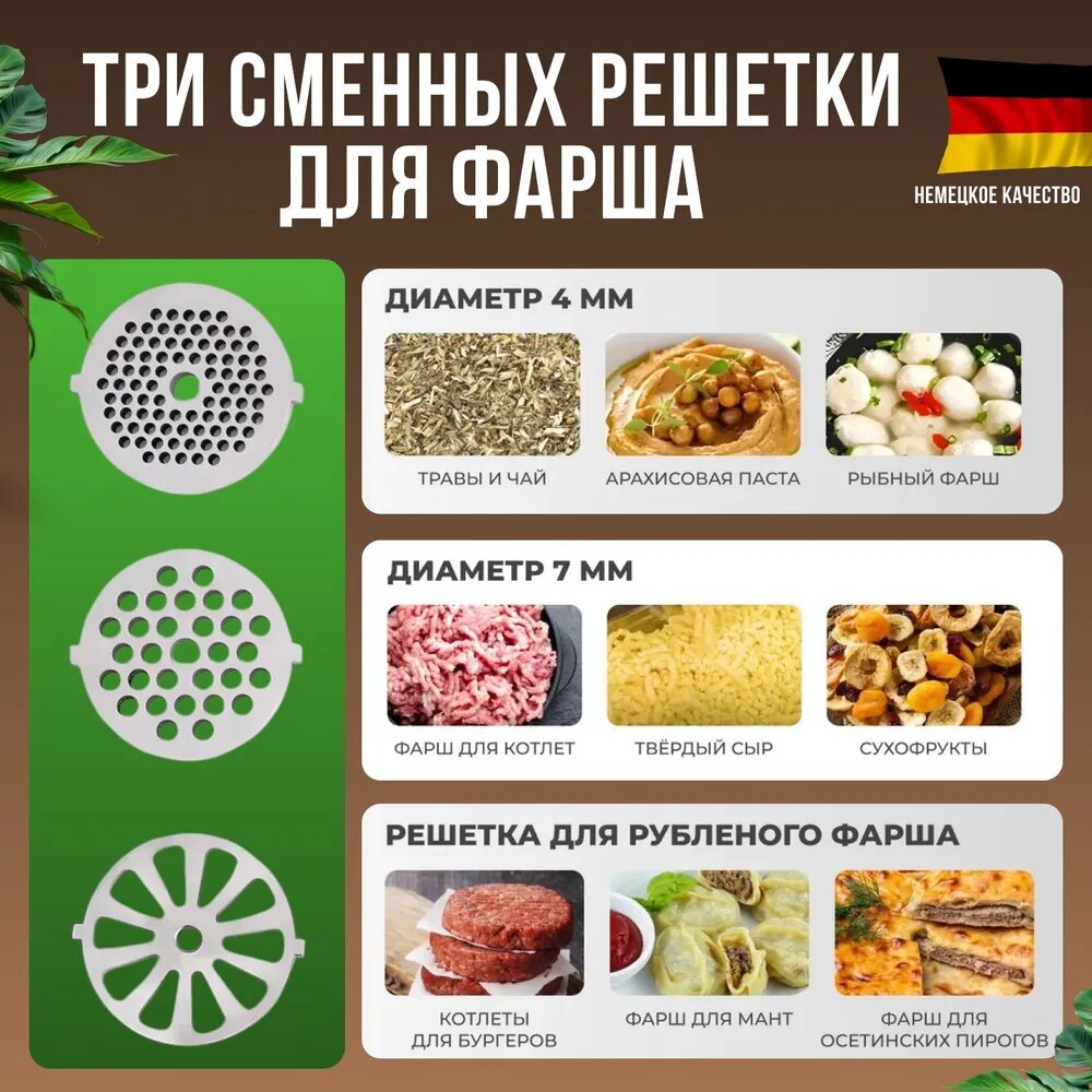 | Насадки | диск для фарша / насадка для кеббе / насадка для приготовления колбас / насадка-терка / формочка для фарша |