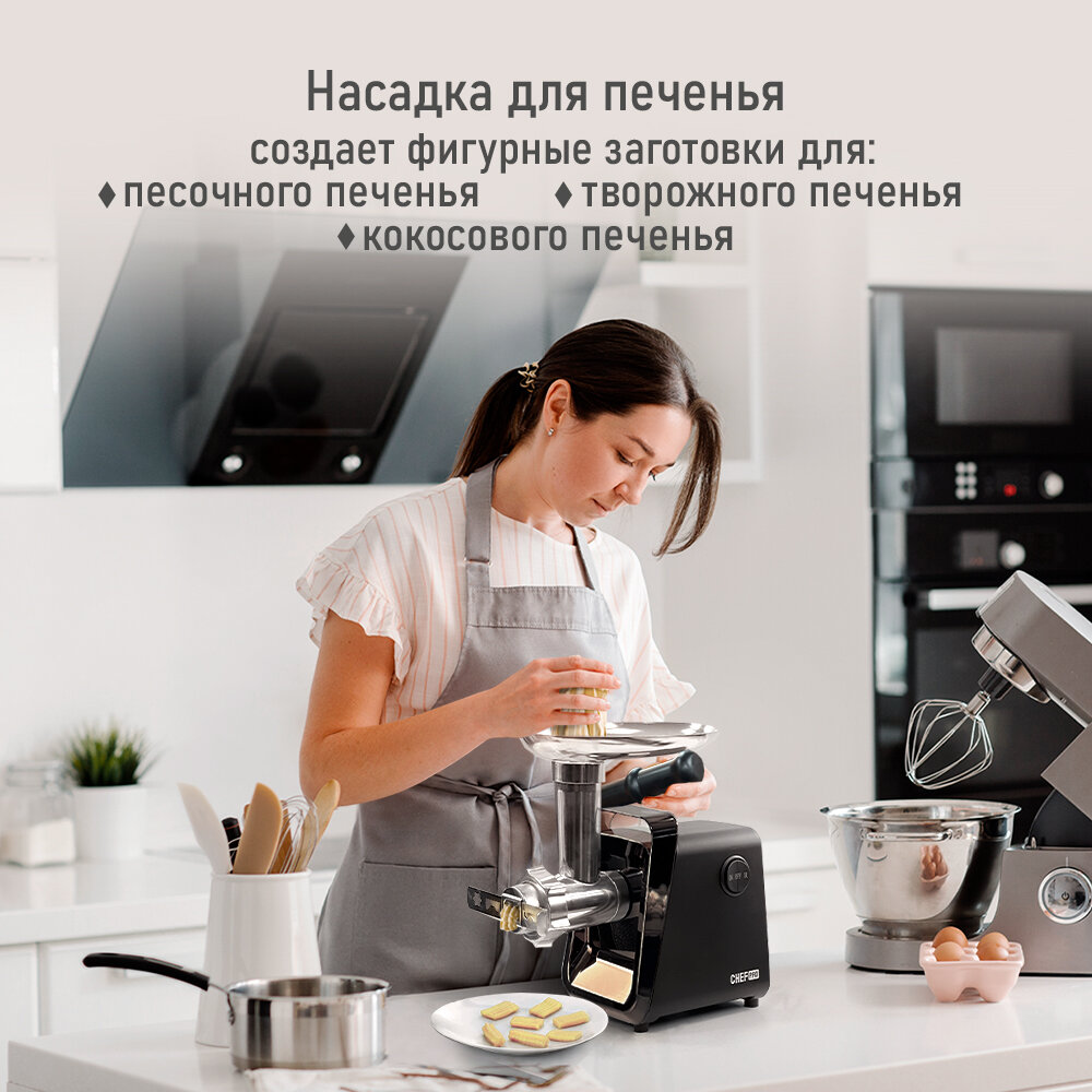 | Насадки | диск для фарша / насадка для кеббе / насадка для нарезки печенья / насадка для приготовления колбас / насадка для шинковки / насадка-терка / соковыжималка |