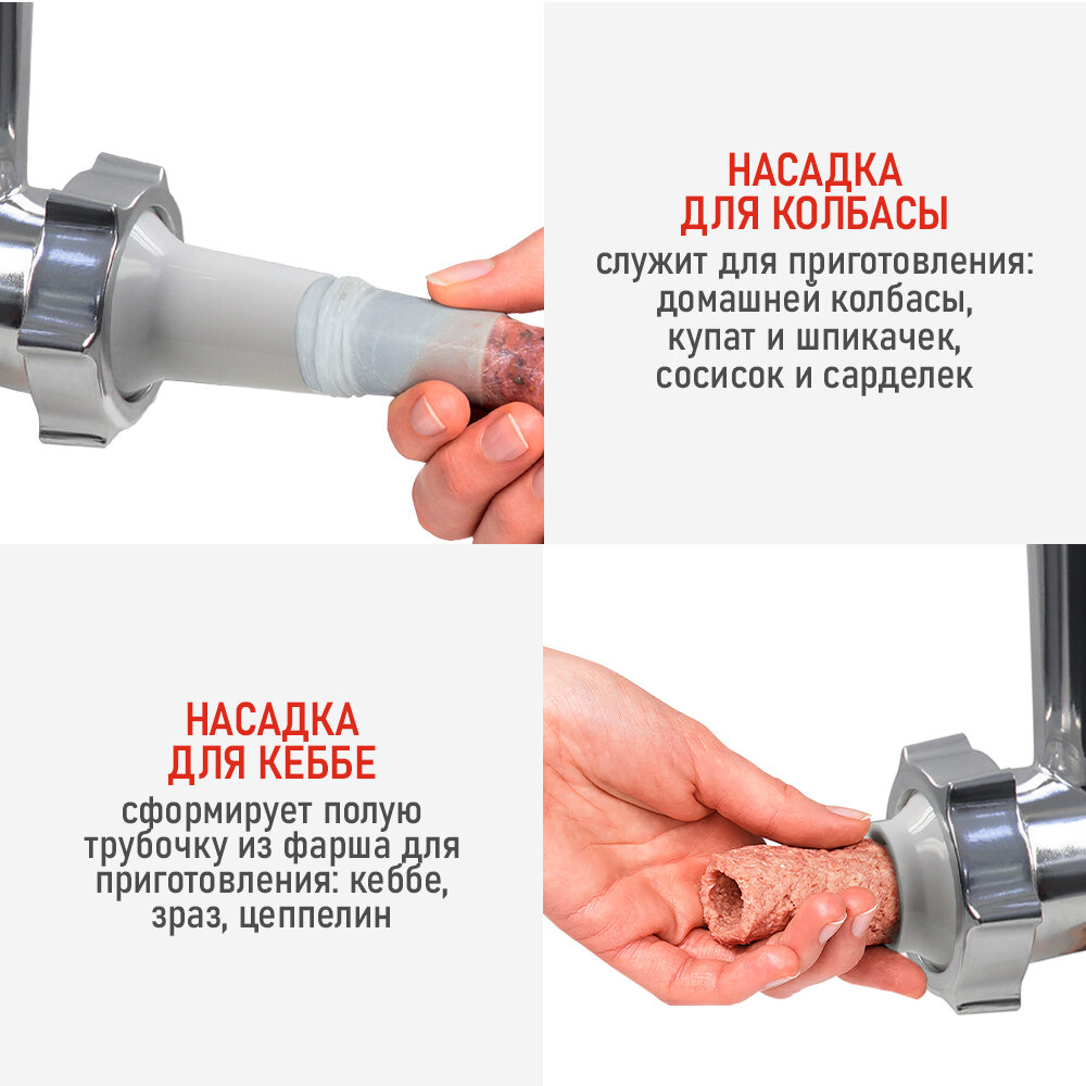 | Насадки | диск для фарша / насадка для кеббе / насадка для нарезки печенья / насадка для приготовления колбас / насадка для шинковки / насадка-терка / соковыжималка |