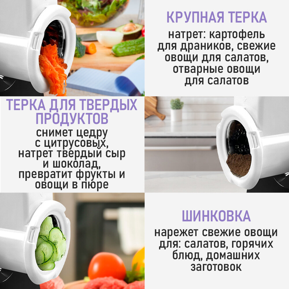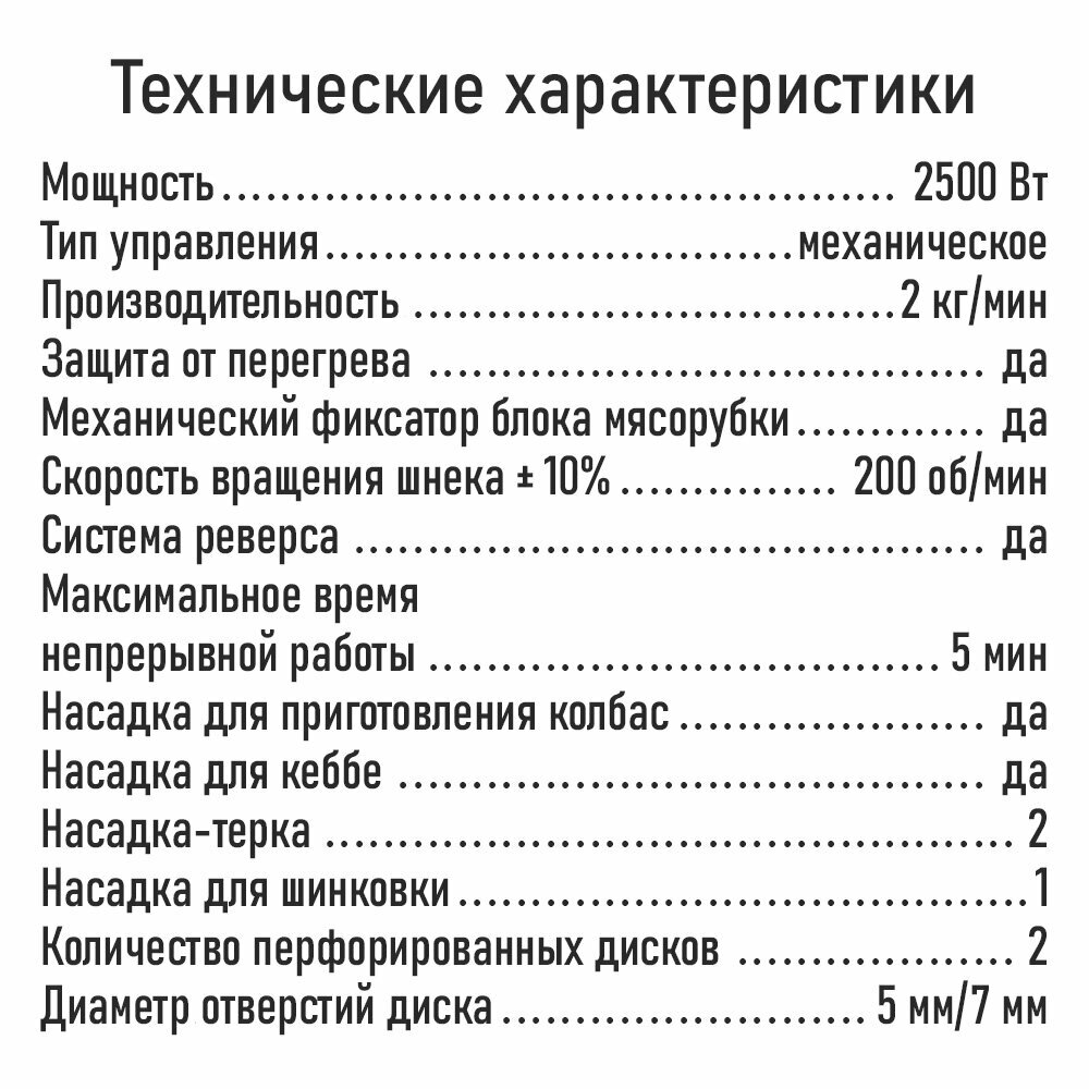 | Насадки | насадка для кеббе / насадка для приготовления колбас / насадка для шинковки |
