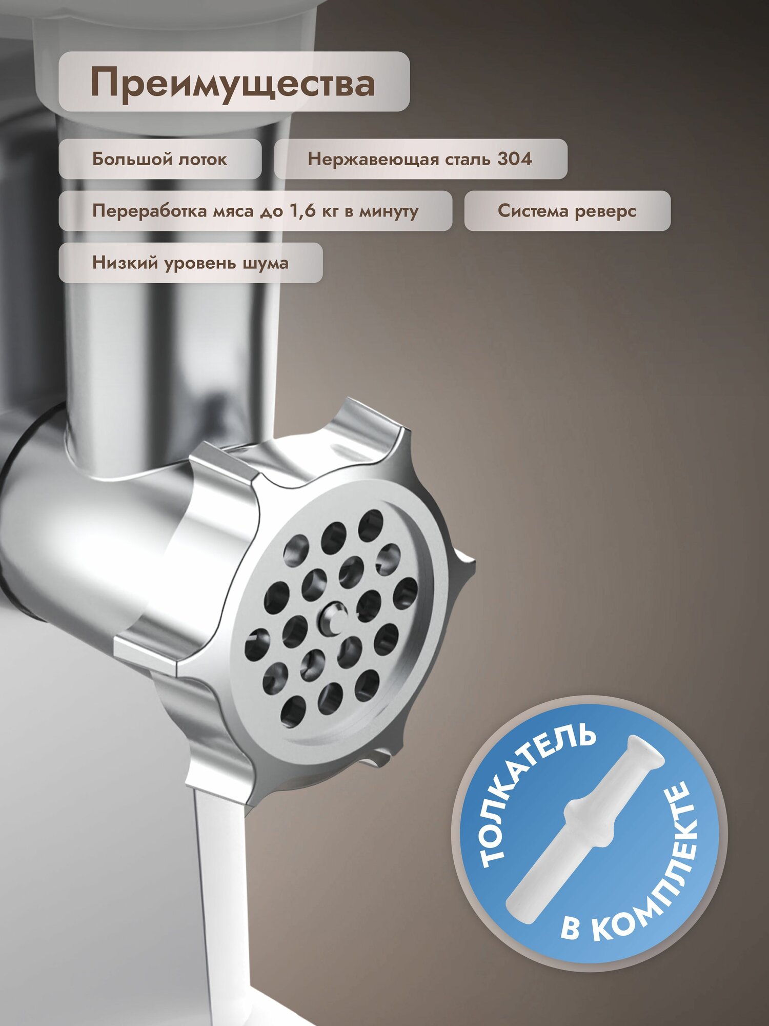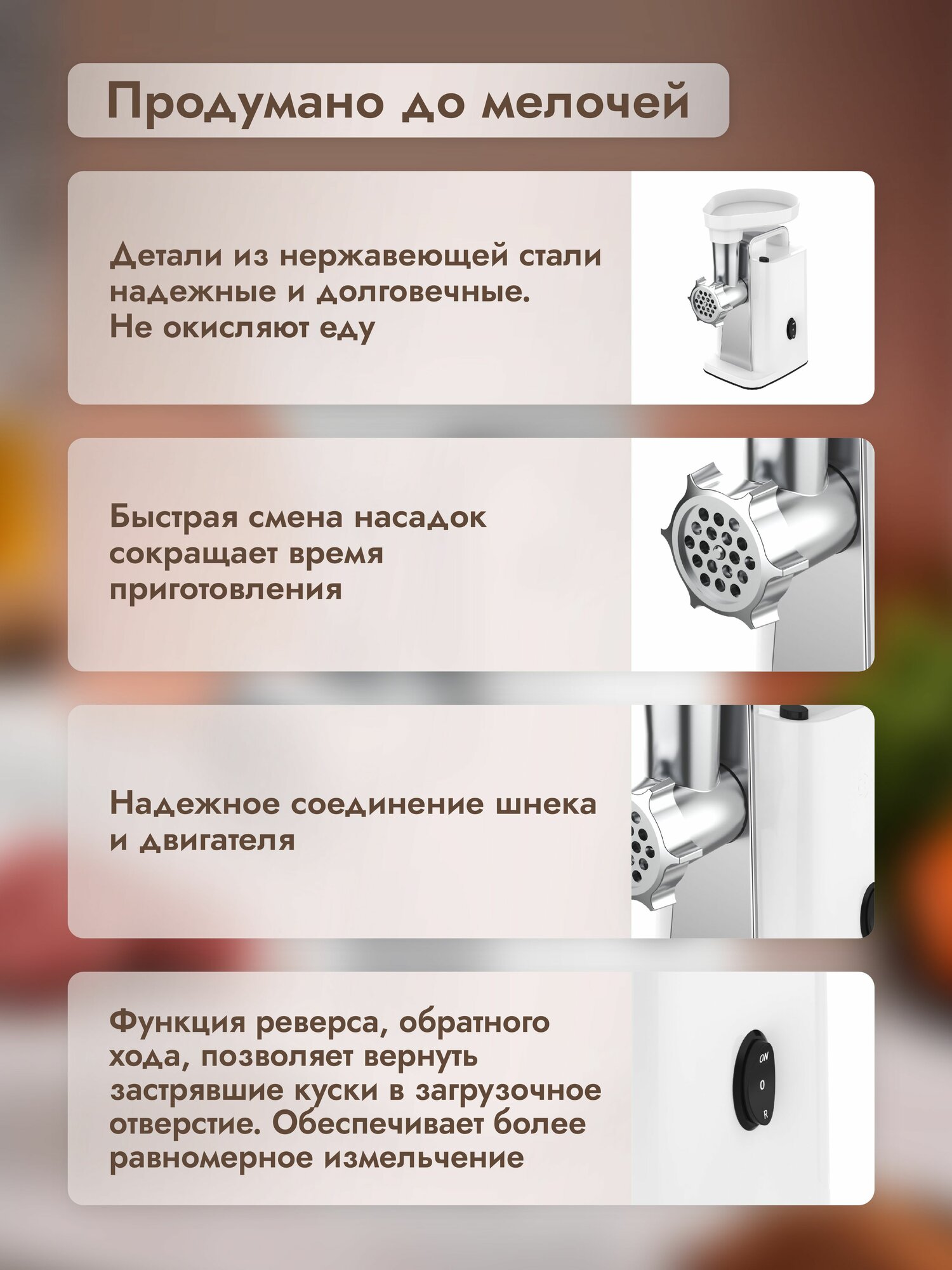 | Насадки | диск для фарша / насадка для кеббе / насадка для приготовления колбас |