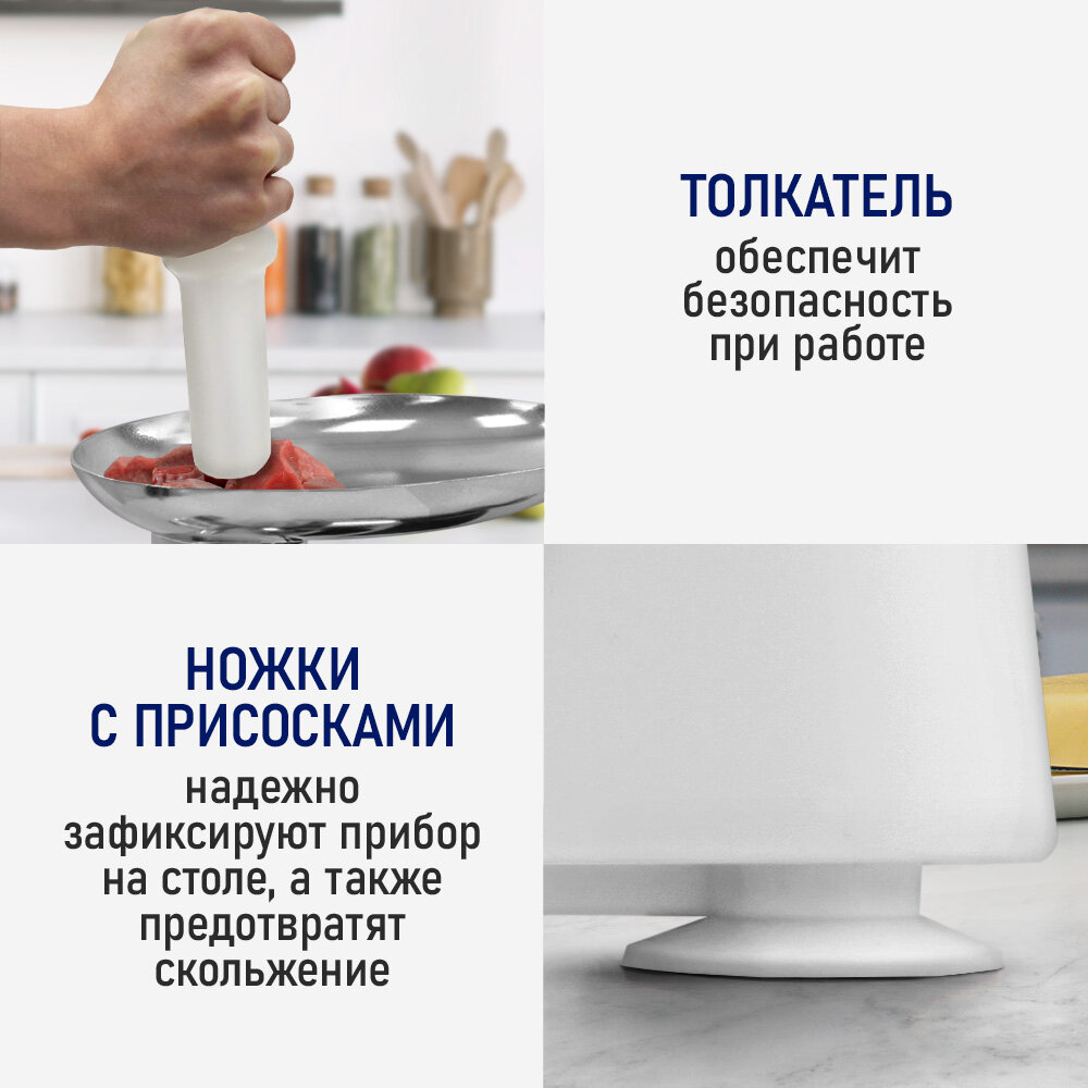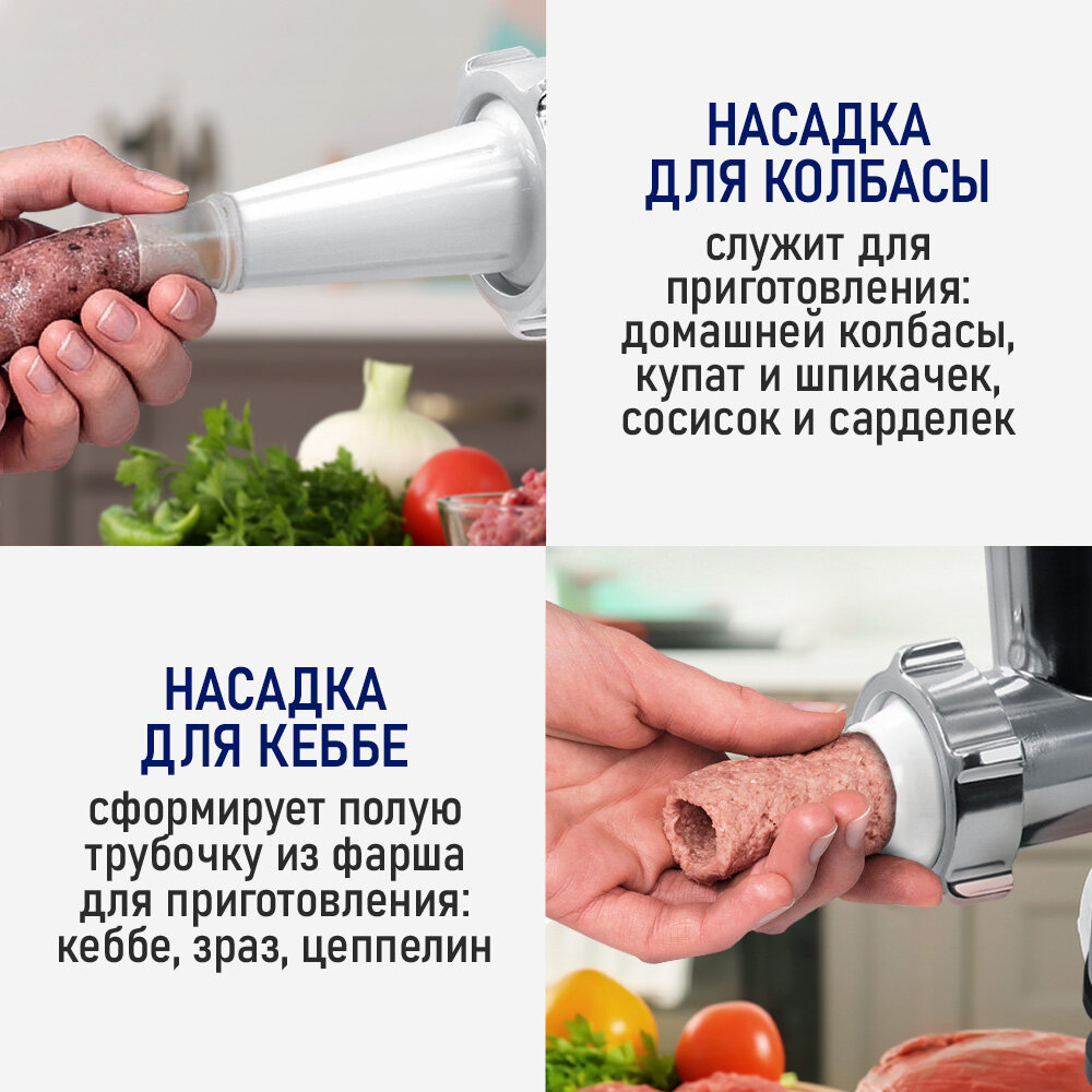 | Насадки | насадка для кеббе / насадка для приготовления колбас / насадка для шинковки / соковыжималка / насадка для печенья |