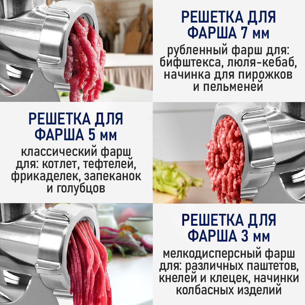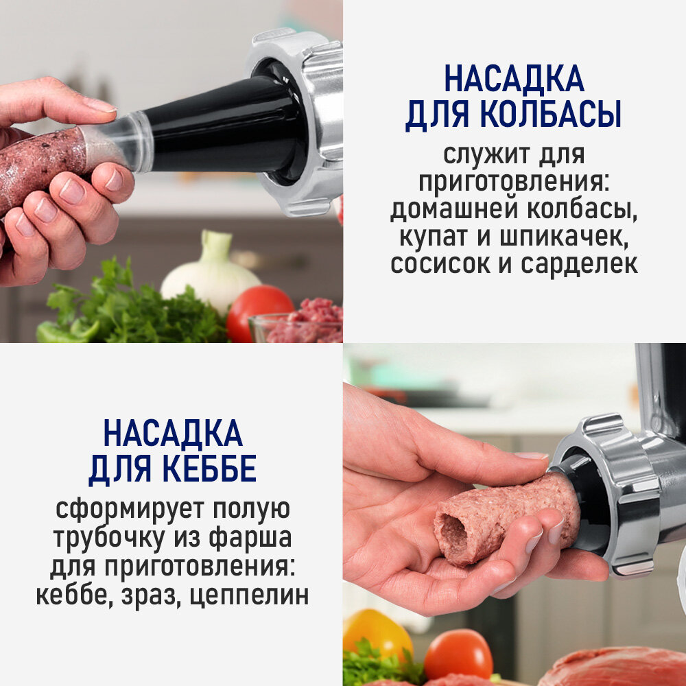 | Насадки | насадка для кеббе / насадка для приготовления колбас / насадка для шинковки / соковыжималка / насадка для печенья |