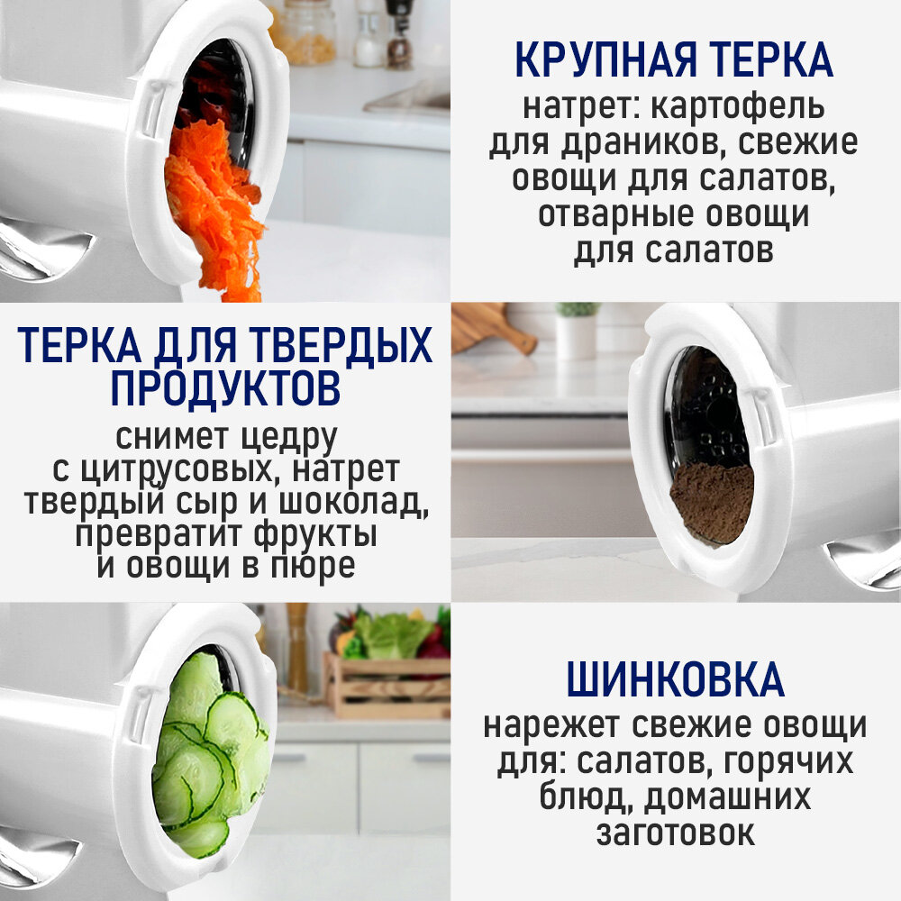 | Насадки | насадка для кеббе / насадка для приготовления колбас / насадка для шинковки / соковыжималка / насадка для печенья |