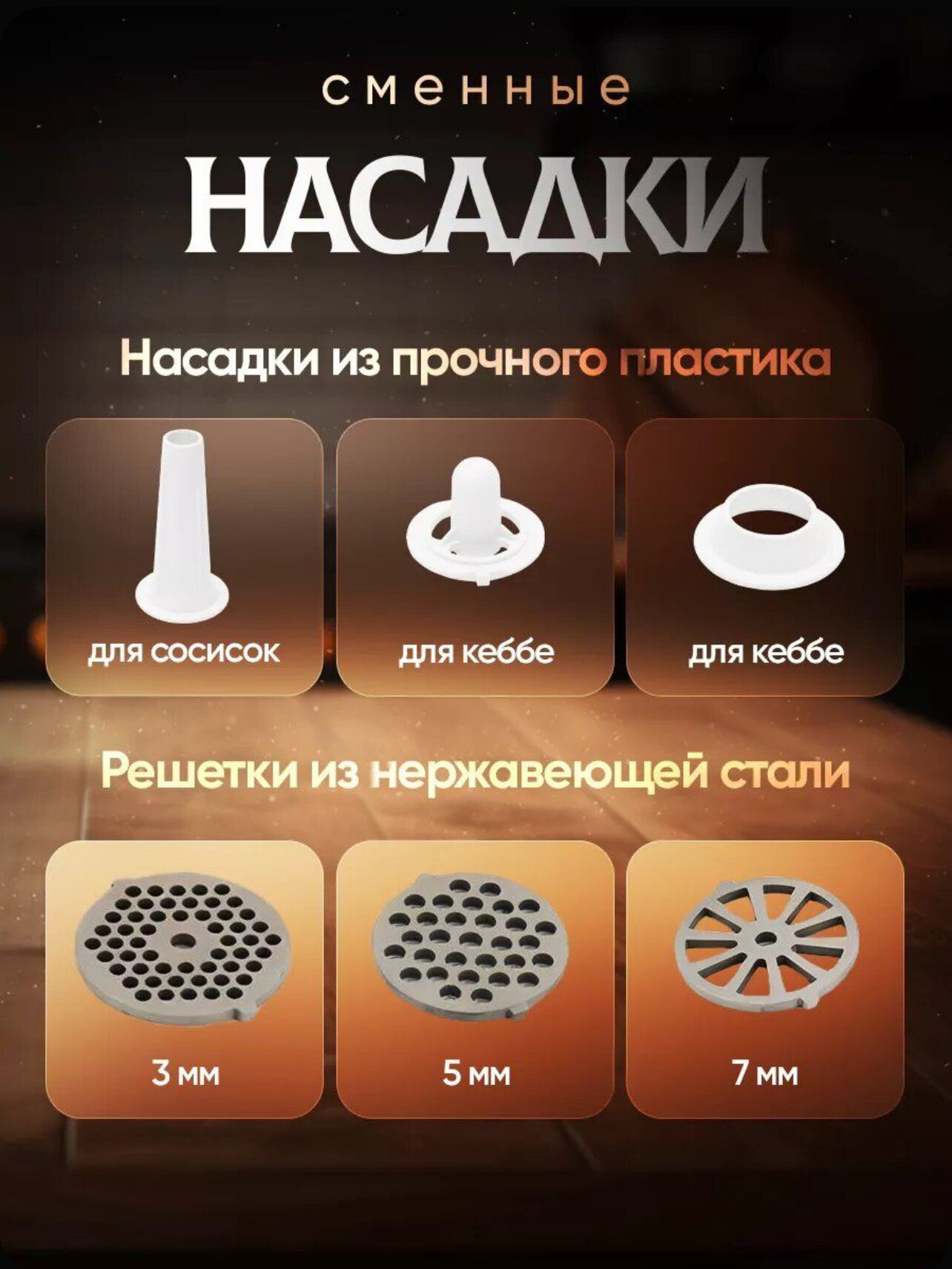 | Насадки | диск для фарша / насадка для приготовления колбас / насадка для шинковки / соковыжималка |