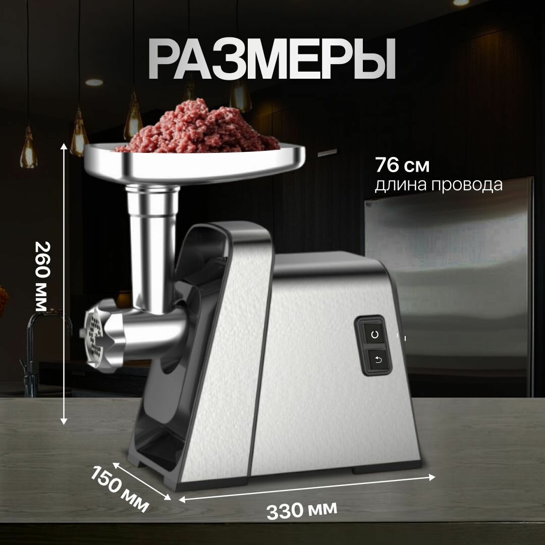 | Дополнительная информация | Высокая мощность: Мощный мотор в 2500 Вт легко справляется даже с самым жестким мясом и другими продуктами. Быстрая работа: Производительность до 5 кг мяса в минуту позволяет быстро приготовить фарш для различных блюд. Удобство использования: Нескользящие прорезиненные ножки обеспечивают стабильность и безопасность во время работы. |