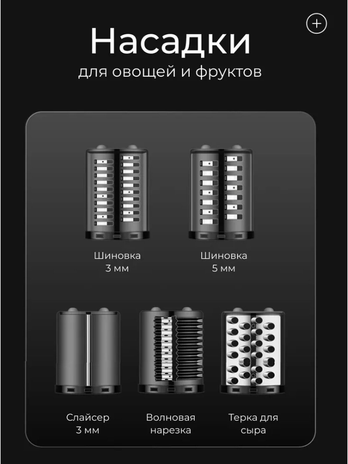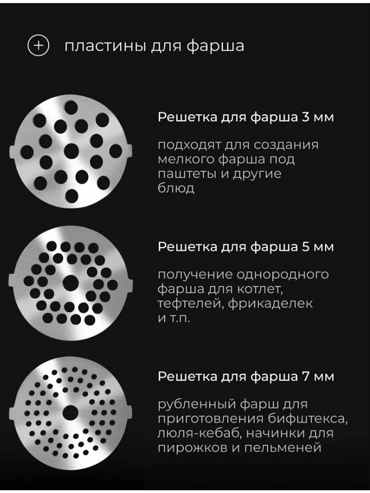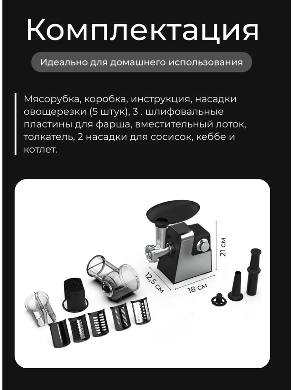 | Насадки | диск для фарша / насадка для кеббе / насадка для приготовления колбас / насадка для шинковки / насадка-терка |