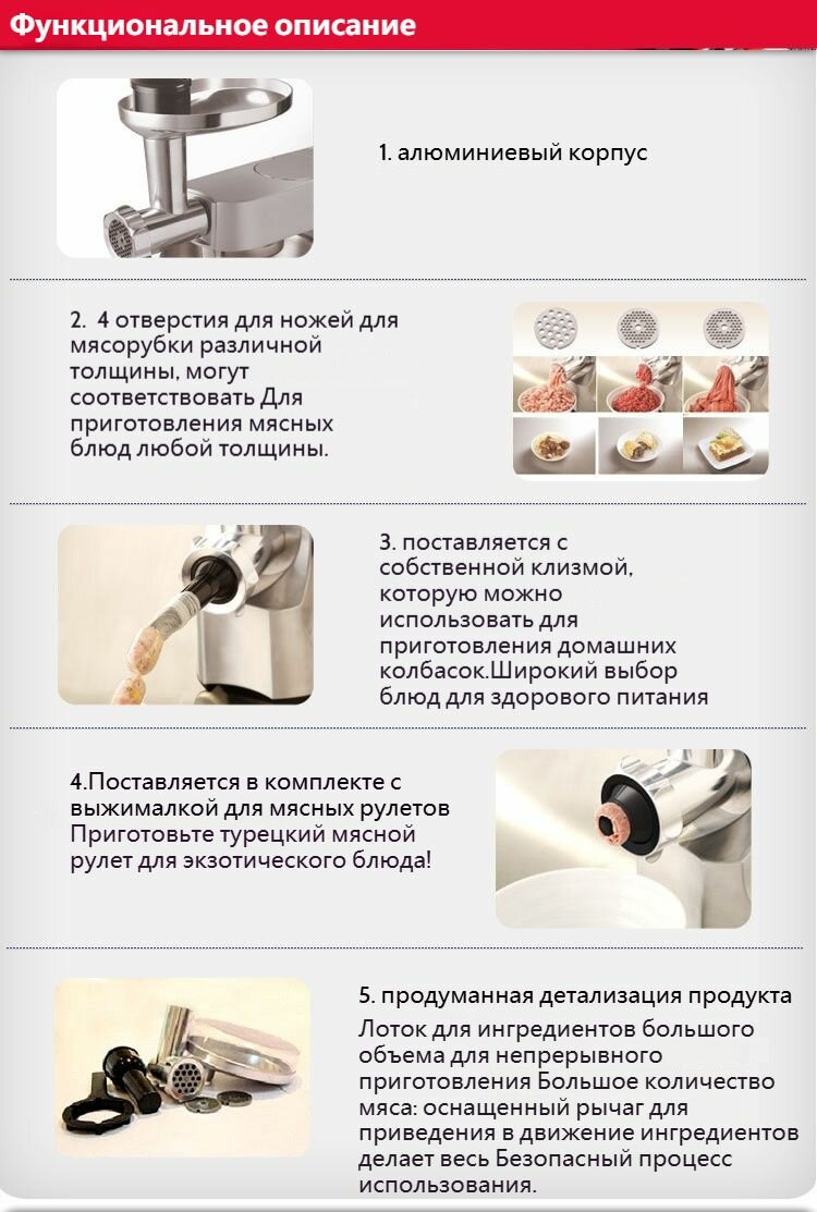 | Насадки | диск для фарша / насадка для приготовления колбас / Для пюре / Насадка-миксер |