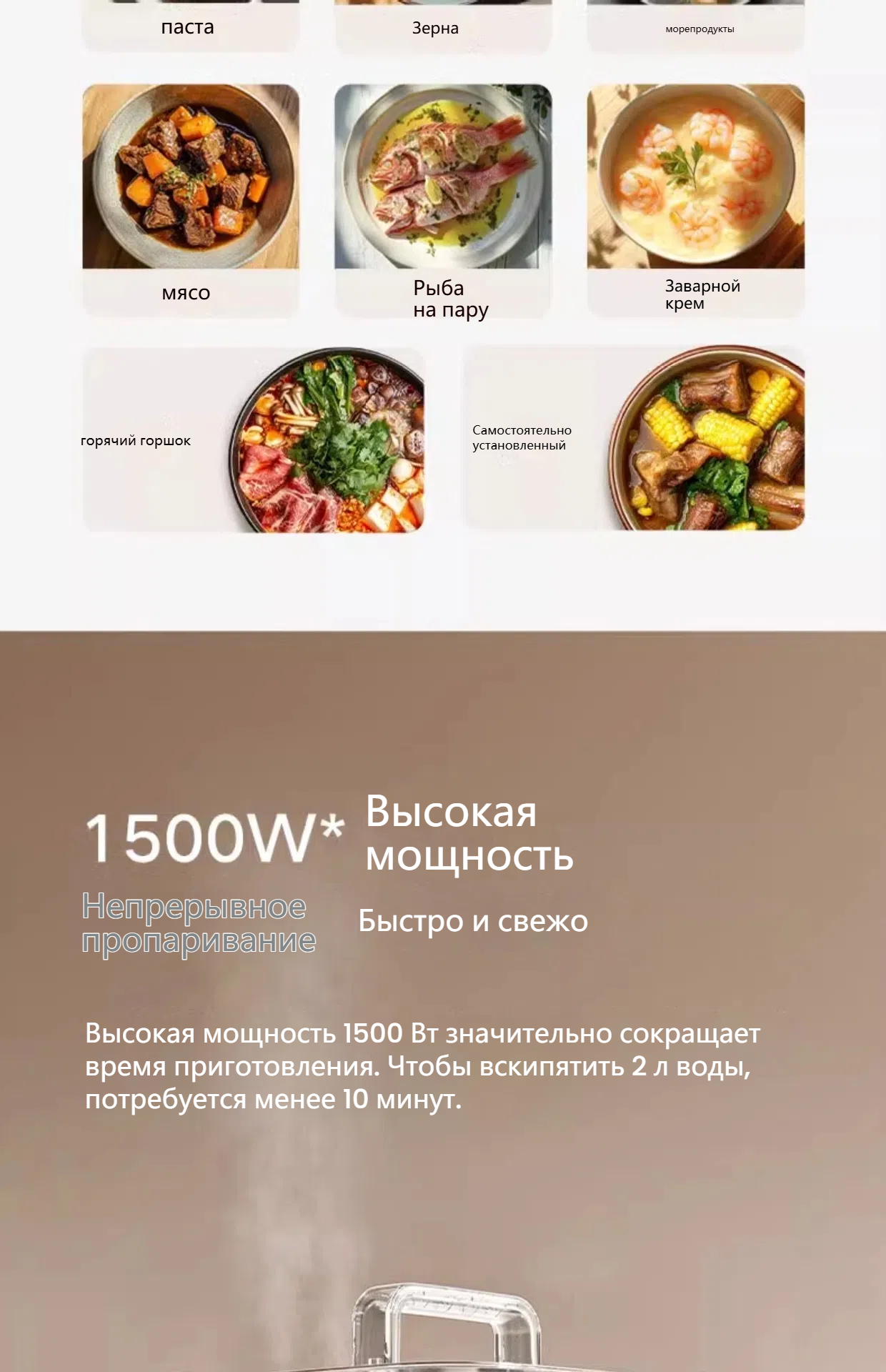 | Комплектация | Корпус горшка x1 Крышка кастрюли x1 Паровая решетка x2 Пароварка x1 Шнур питания x1 |