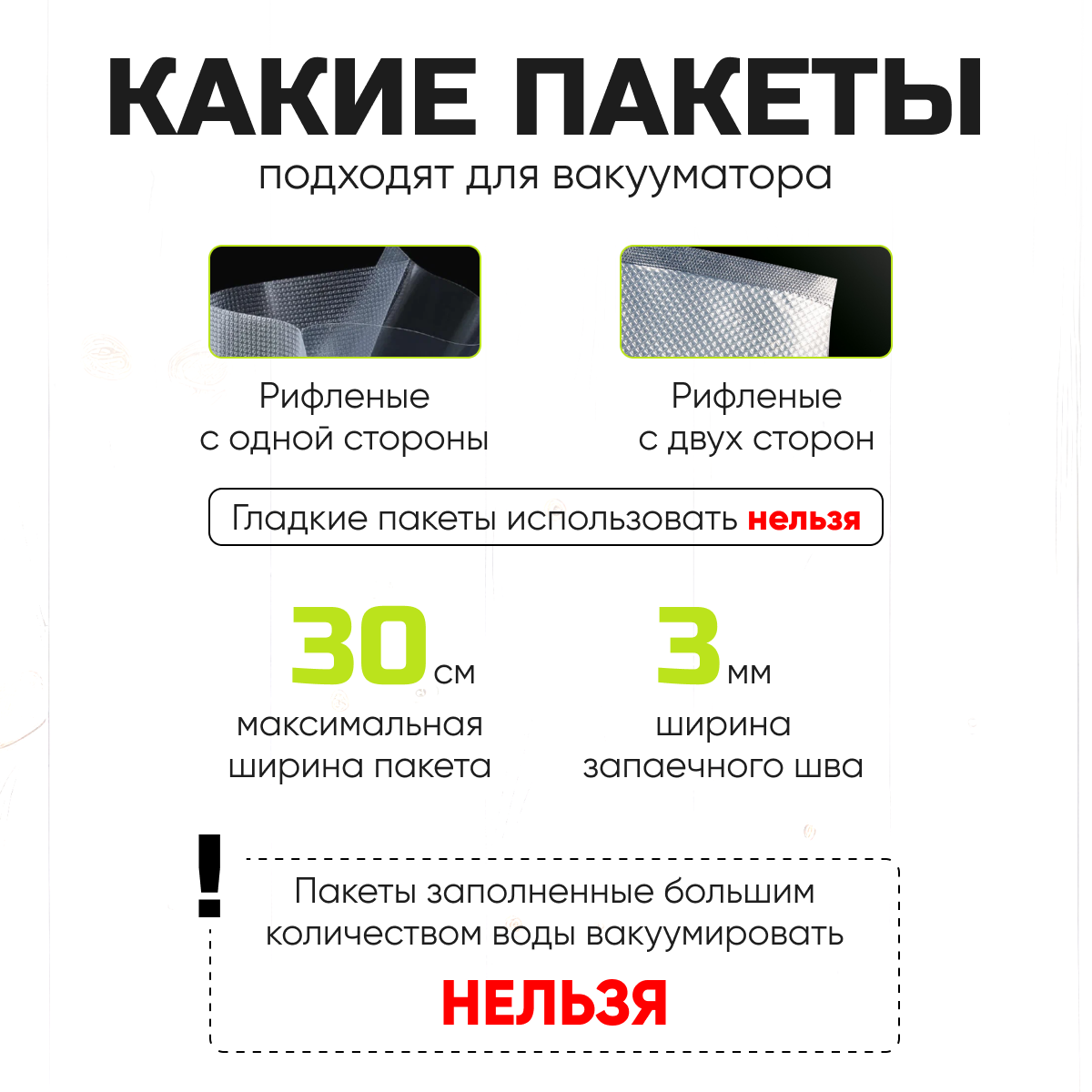 | Дополнительная информация | Использовать рифленые пакеты (30 см максимальная ширина), гладкие пакеты использовать нельзя |