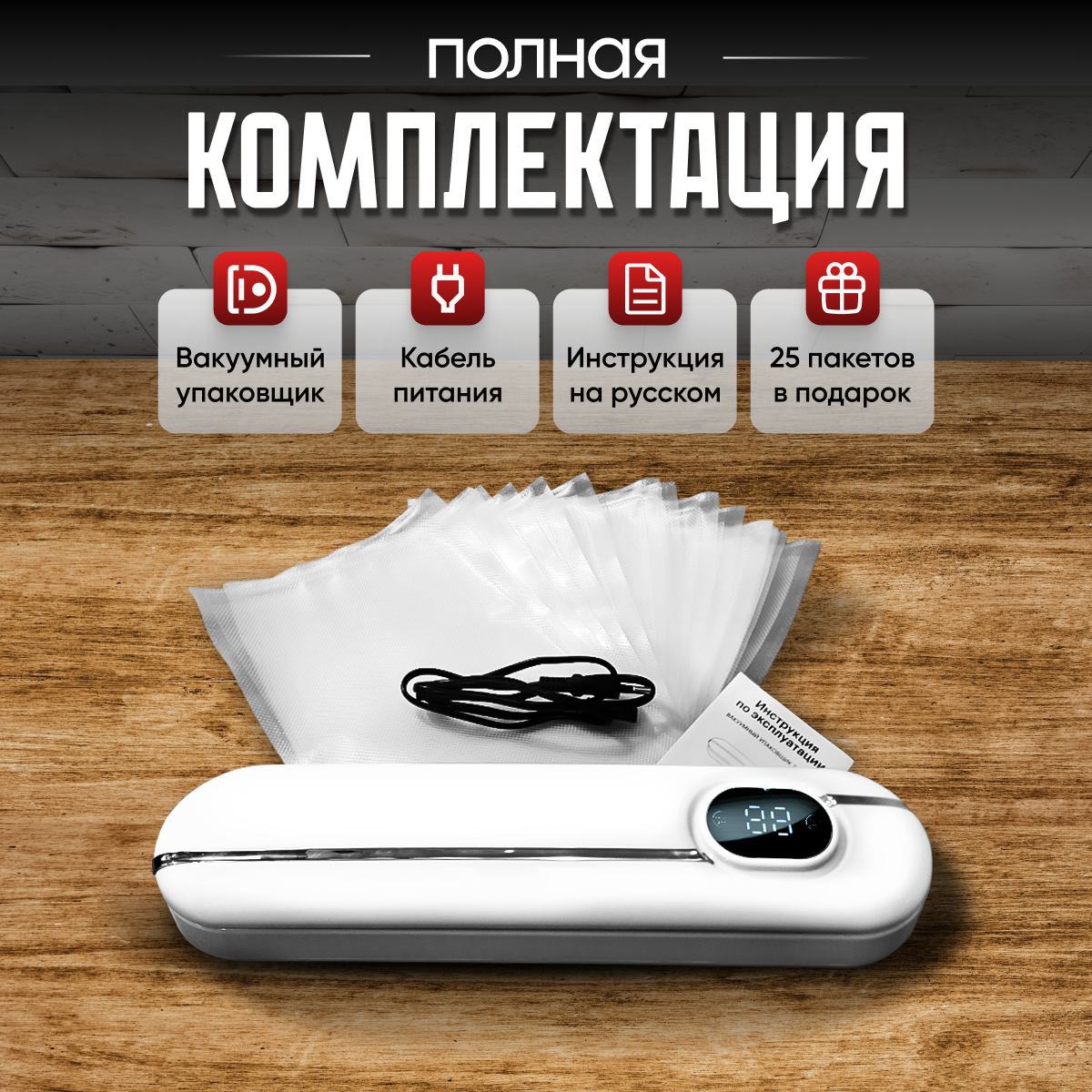 | Подробная комплектация | Вакууматор для продуктов; шнур; 25 пакетов; инструкция на русском языке |