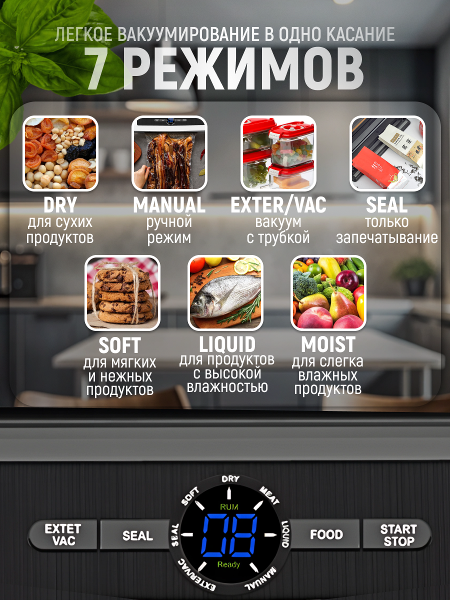 | Особенности | Встроенный резак для пакетов, Выбор режима для сухих и влажных продуктов, Импульсный режим, Работа с ёмкостями, Регулировка мощности насоса, Функция дополнительного уплотнения |