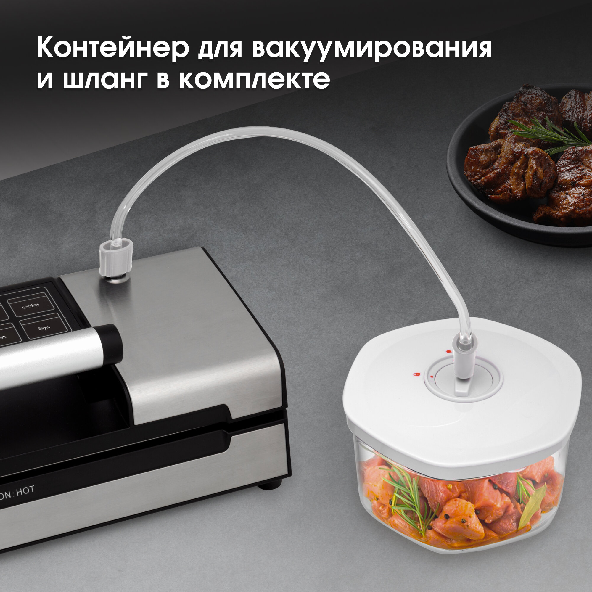 | Подробная комплектация | вакуумный упаковщик, рулон для вакуумной упаковки, вакуумный контейнер, вакуумный шланг, гарантийный талон, инструкция |