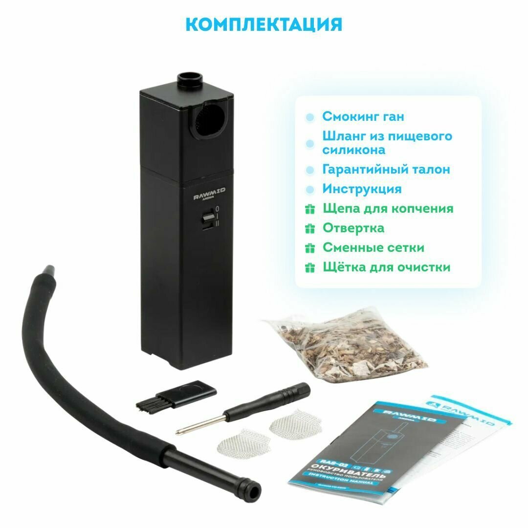 | Подробная комплектация | Дымогенератор, силиконовый шланг, инструкция. Подарок за отзыв: Щетка, щипа, доп сетки, отвертка. |