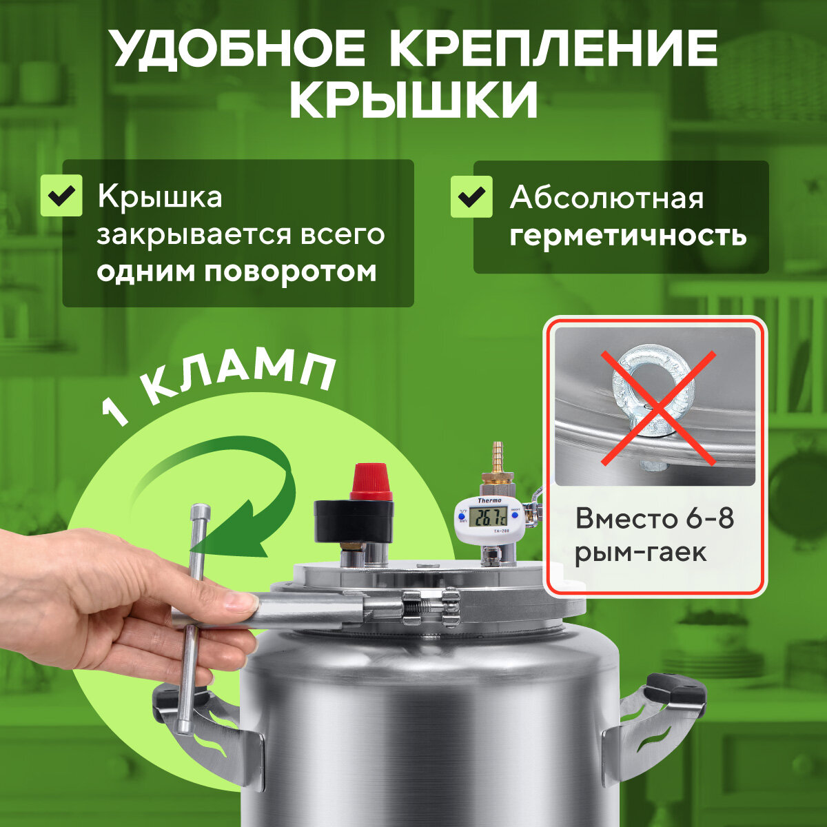 | Подробная комплектация | Емкость автоклава, крышка, фальшдно, уплотнение клампа, хомут клампа, ключ для клампа, кран, штуцер, манометр, термометр, предохранительный клапан, зажим для термометра, обратный клапан, хомут для шланга, шанг, инструкция |