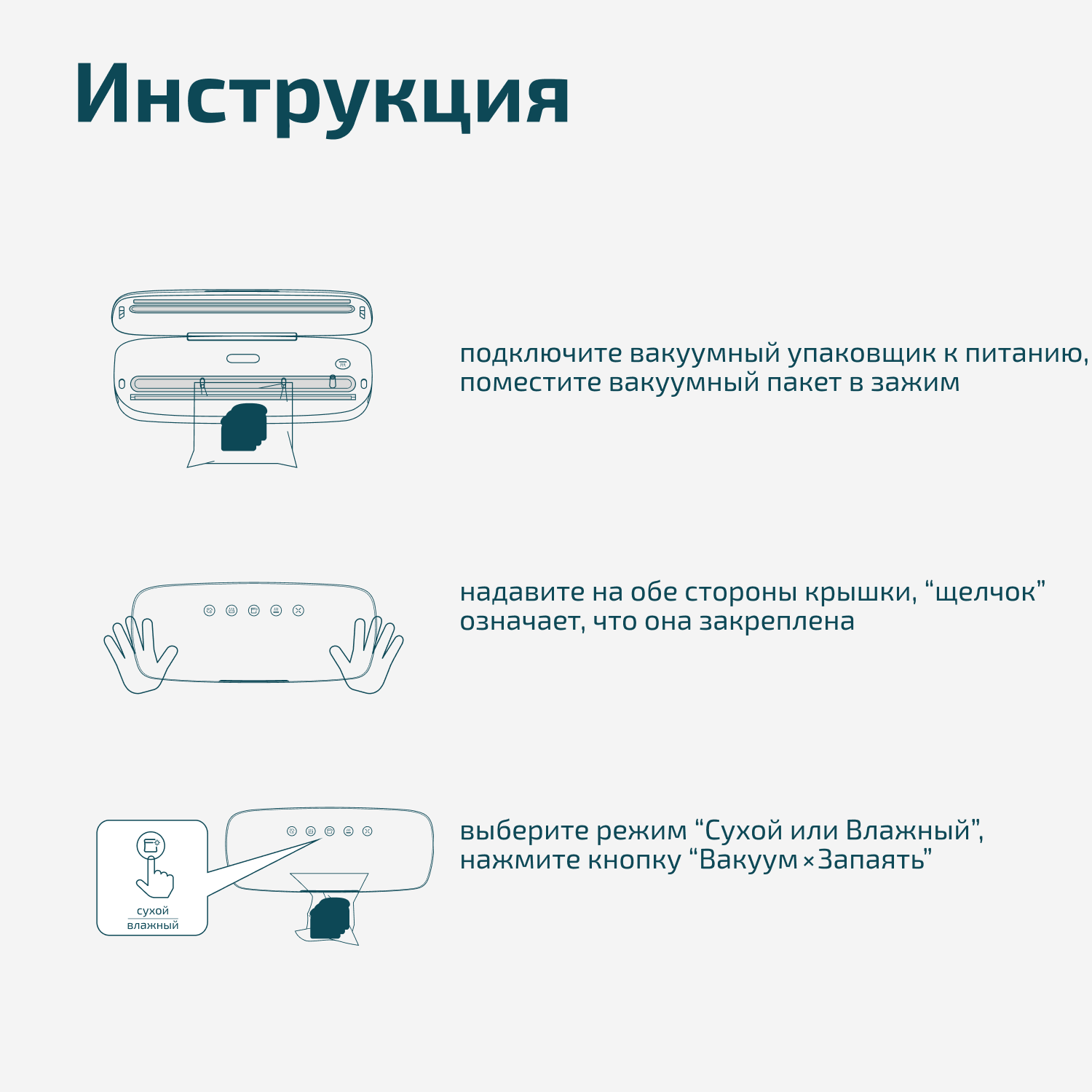 | Подробная комплектация | Вакууматор, Коробка, Инструкция на русском языке, Трубка для запайки, Пакеты для вакуумирования |