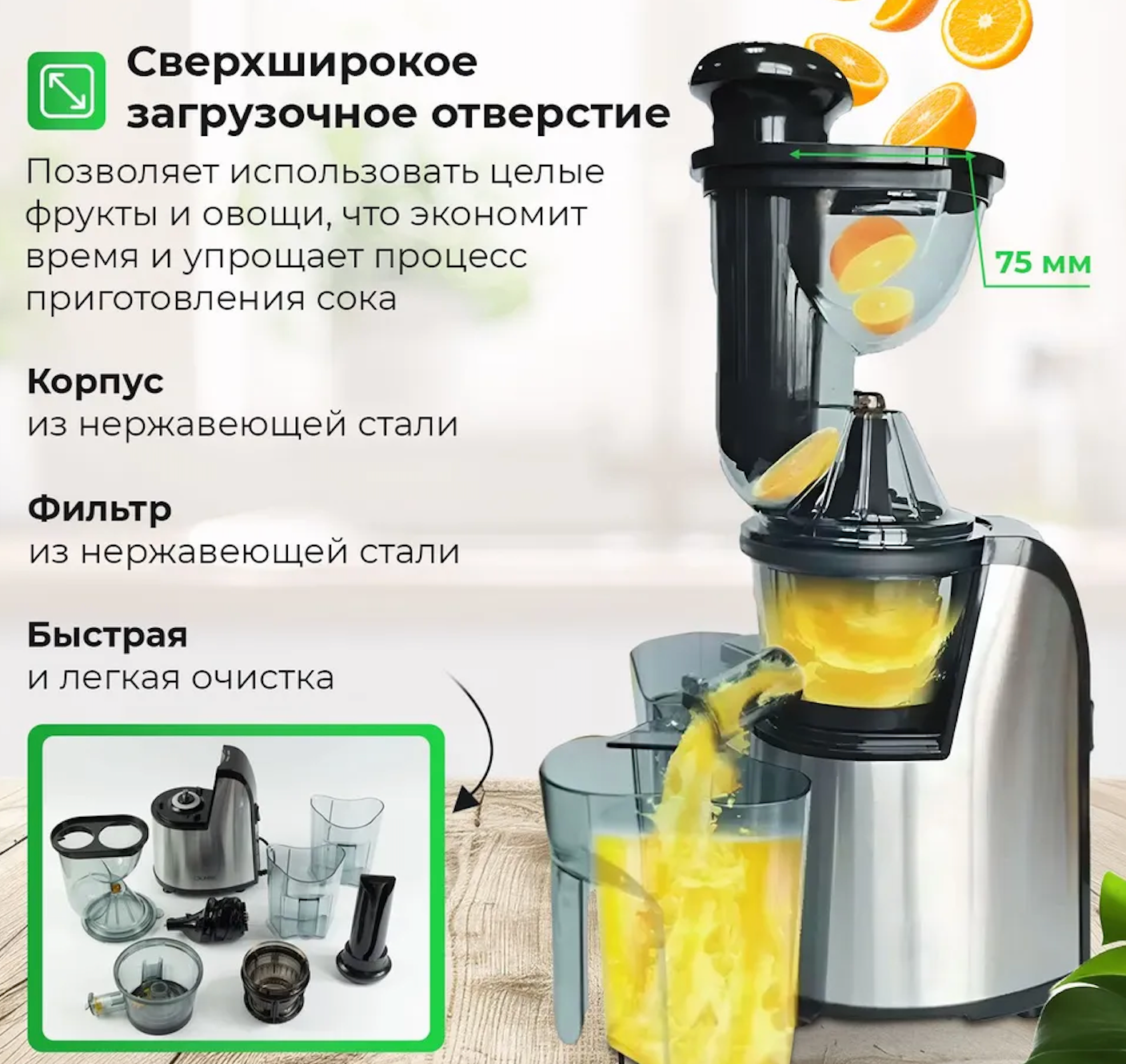 | Дополнительная информация | Эта соковыжималка обеспечивает максимальную производительность при экстракции чистого сока. Он очень эффективен в соке, доставляя еще больше сока и меньше отходов |