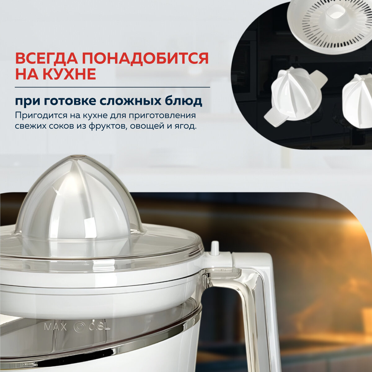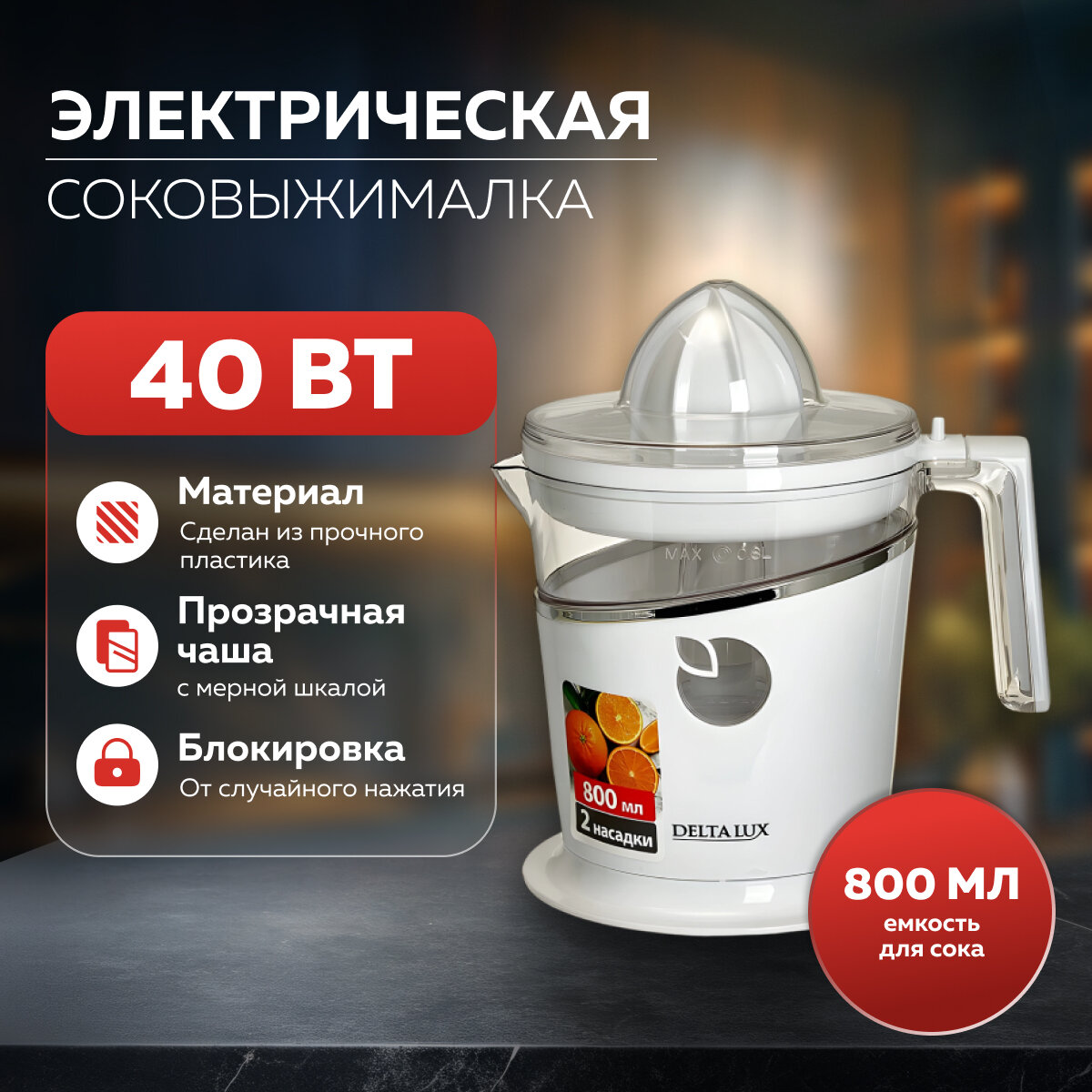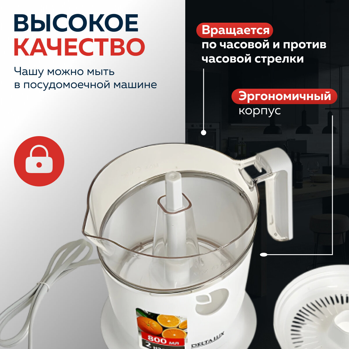 Соковыжималка цитрусовая Delta Lux DE-2401, 40 Вт, 800 мл, 2 насадки, с регилировкой фильтрации, белая интересное: