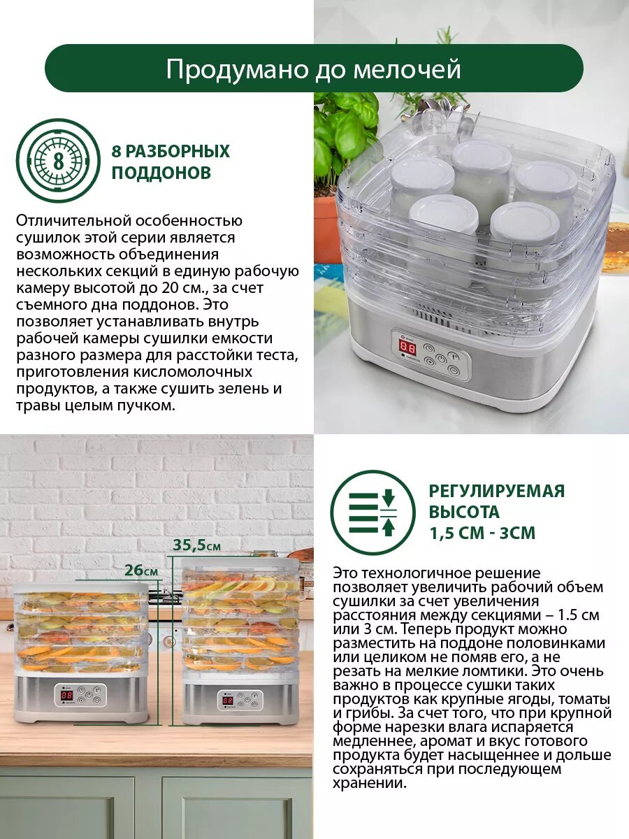 | Доп. опции сушки для овощей | Регулирование высоты лотка, Регулировка температуры, таймер |