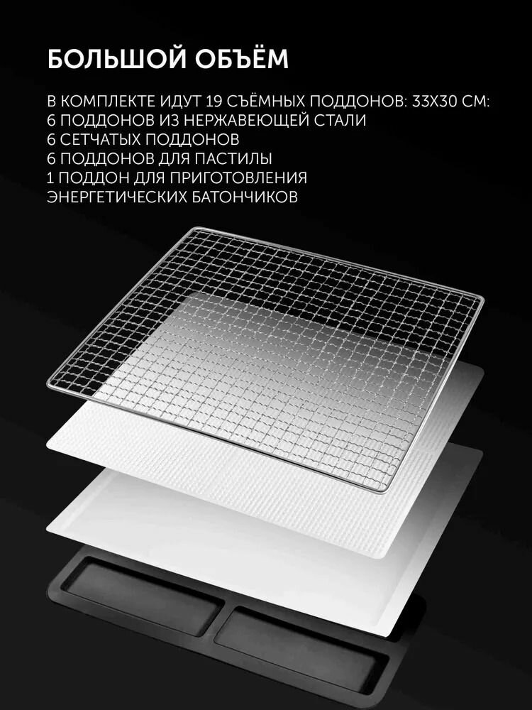 | Комплектация | Прибор PFD 2402H Pro - 1 шт.; Поддоны из нержавеющей стали - 6 шт.; Сетчатые листы - 6 шт.; Поддоны для пастилы - 6 шт.; Лоток для приготовления энергетических батончиков - 1 шт.;. Руководство по эксплуатации - 1 шт.; Гарантийный талон - 1 шт.; Упаковка (полиэтиленовый пакет + коробка) - 1 шт. |
