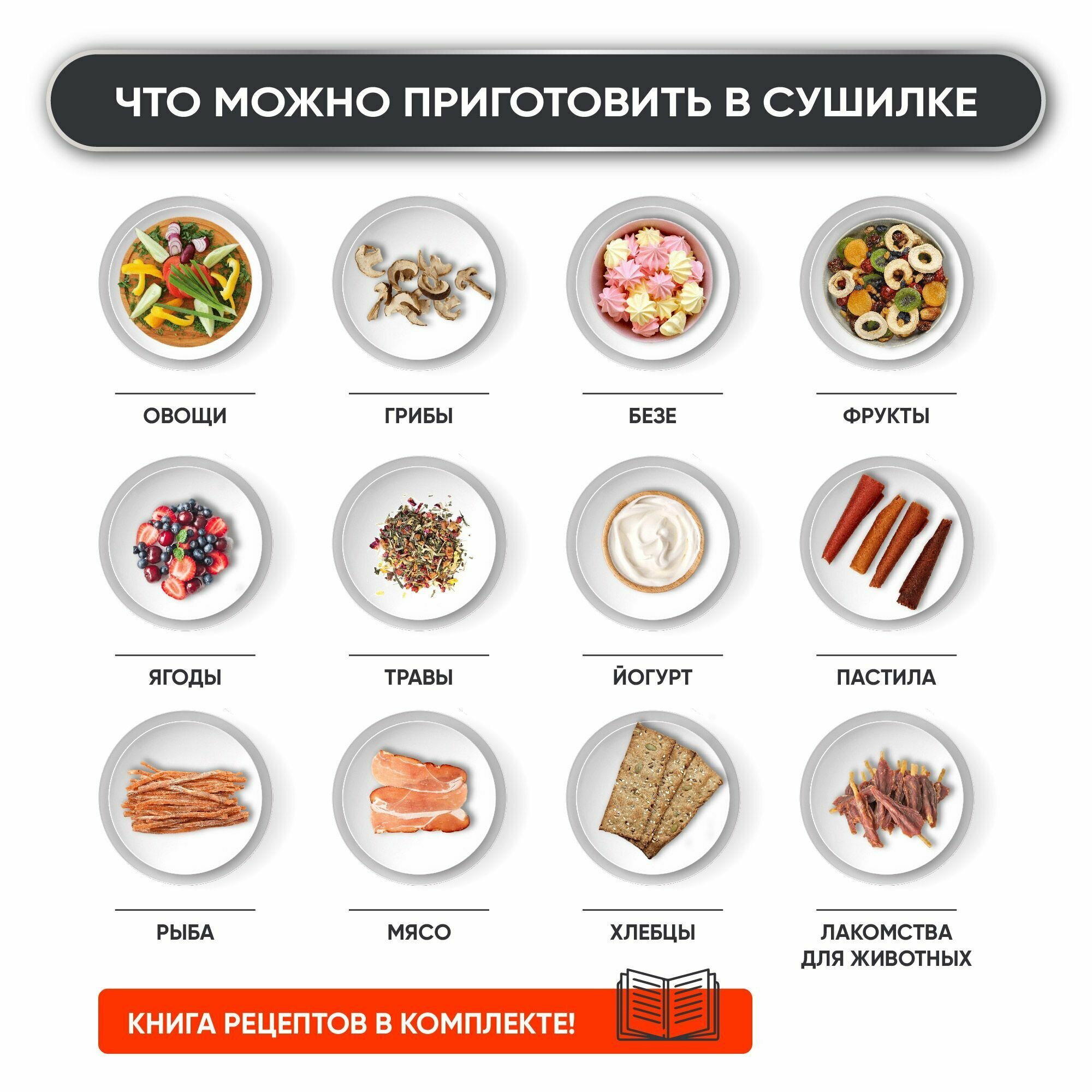| Комплектация | сушилка для овощей и фруктов 4 поддона для пастилы таймер на 24 часа книга рецептов инструкция |