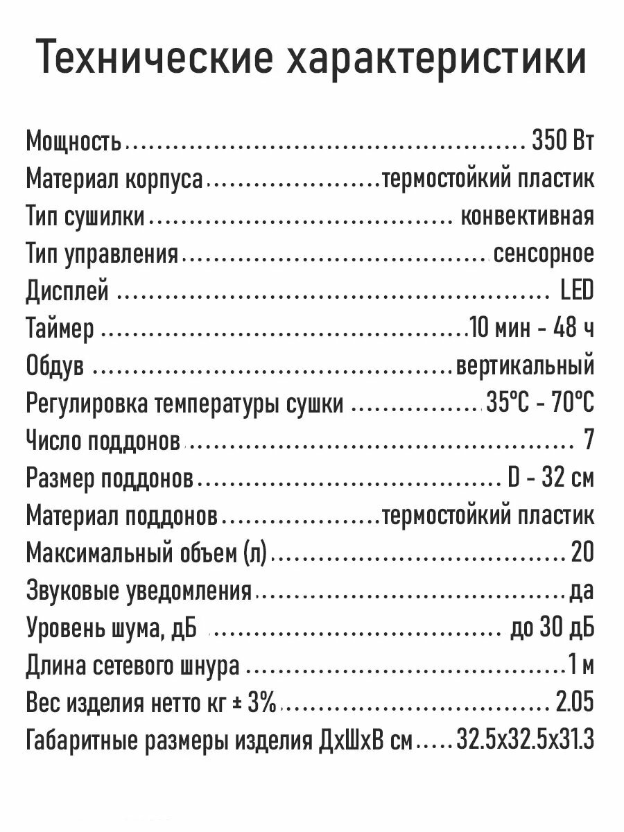 | Доп. опции сушки для овощей | вяление мяса и рыбы, сушка рыбы |