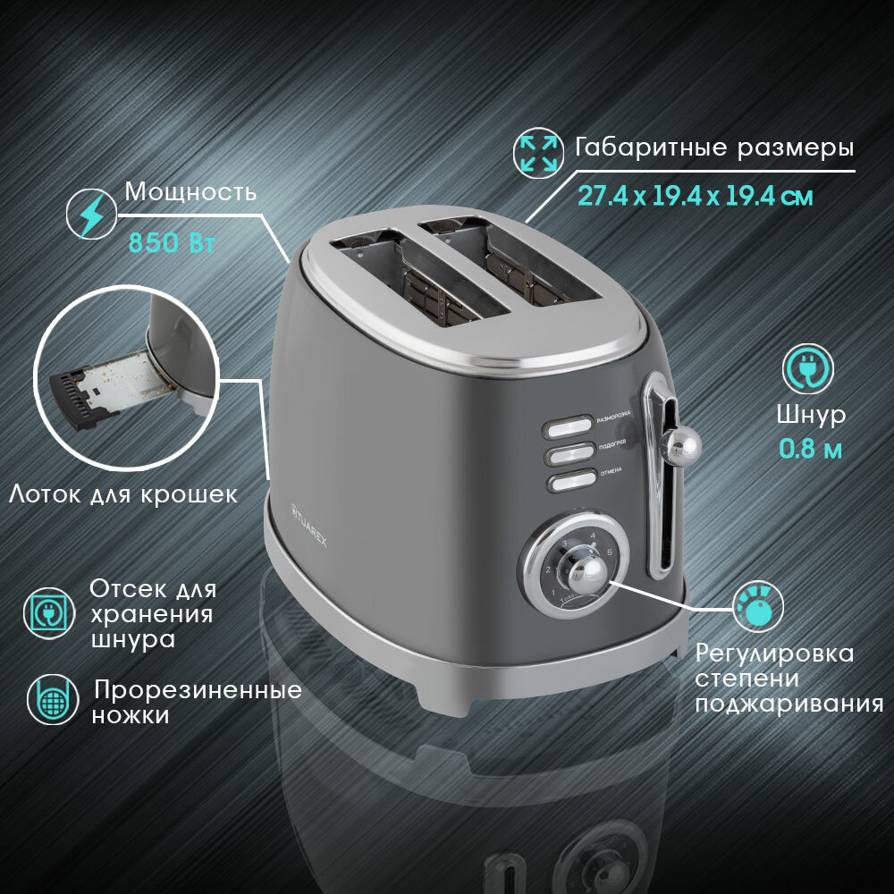 Тостер TUAREX TK-6005, 6 режимов, мощность 800 Вт, черный/светлый серый