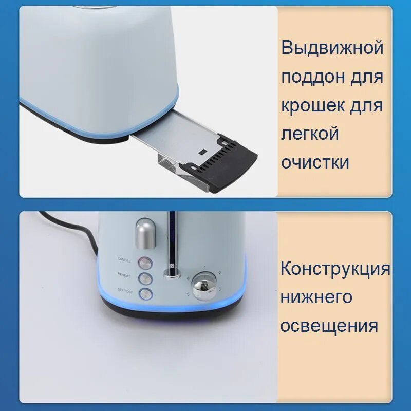 Тостер Xinzhida TS-6168, 6 степеней прожарки, 800 Ватт, синий