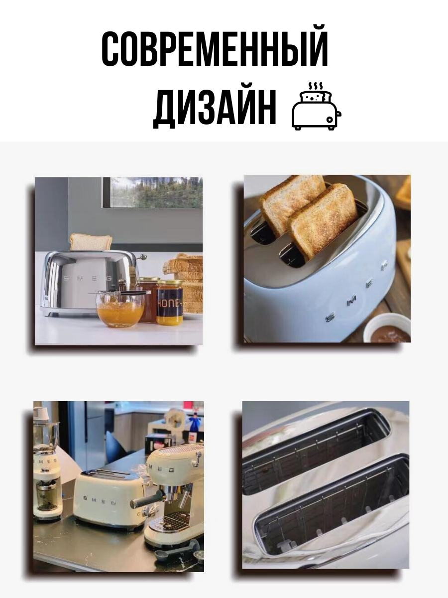 Тостер Smeg "Retro", белый, 950W, 2 тоста, механическое управление, 19.8x31.0 см интересное: