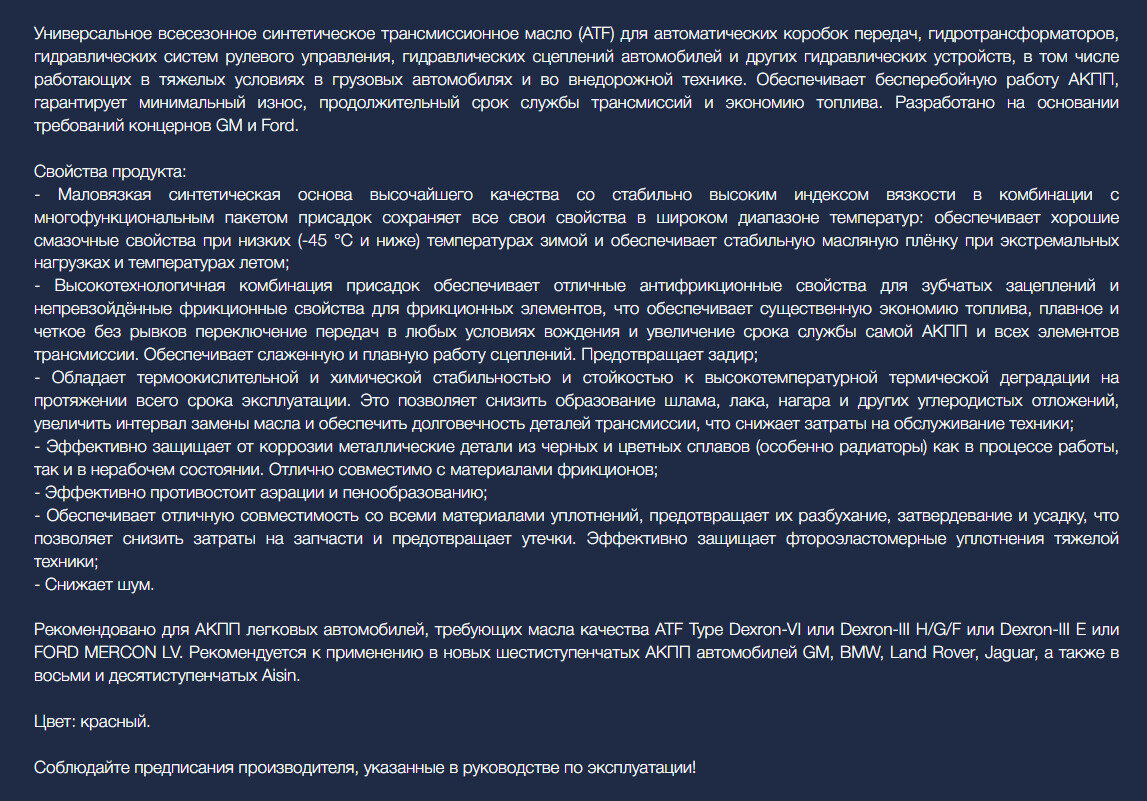 | Стандарт ATF | Dexron VI |