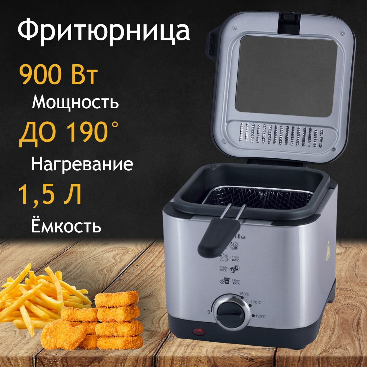 Фритюрница электрическая, 1.5 л, 6 режимов температуры, съемная чаша, серебристый
