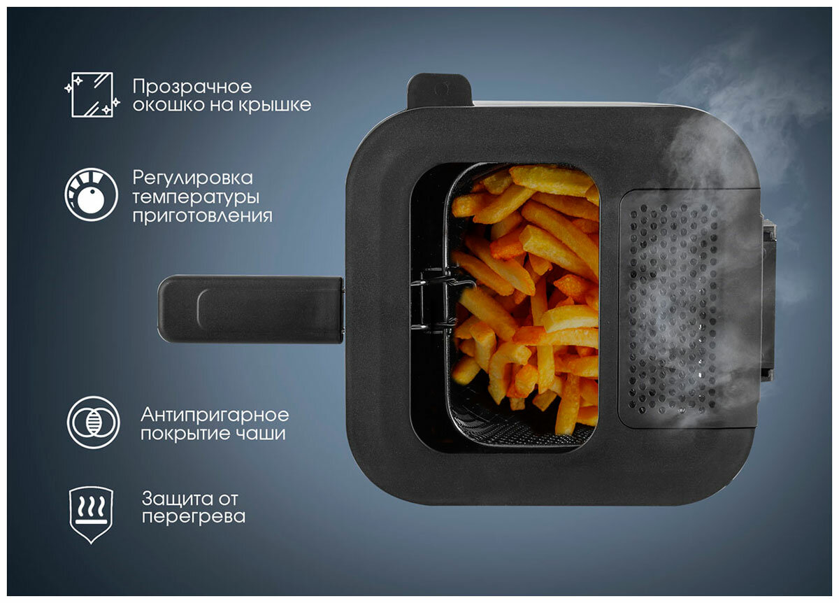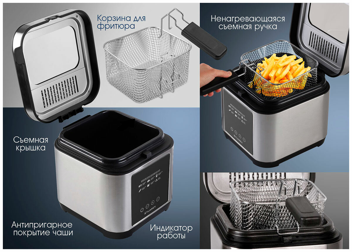 Фритюрница электрическая, 1.5 л, 6 режимов температуры, съемная чаша, серебристый