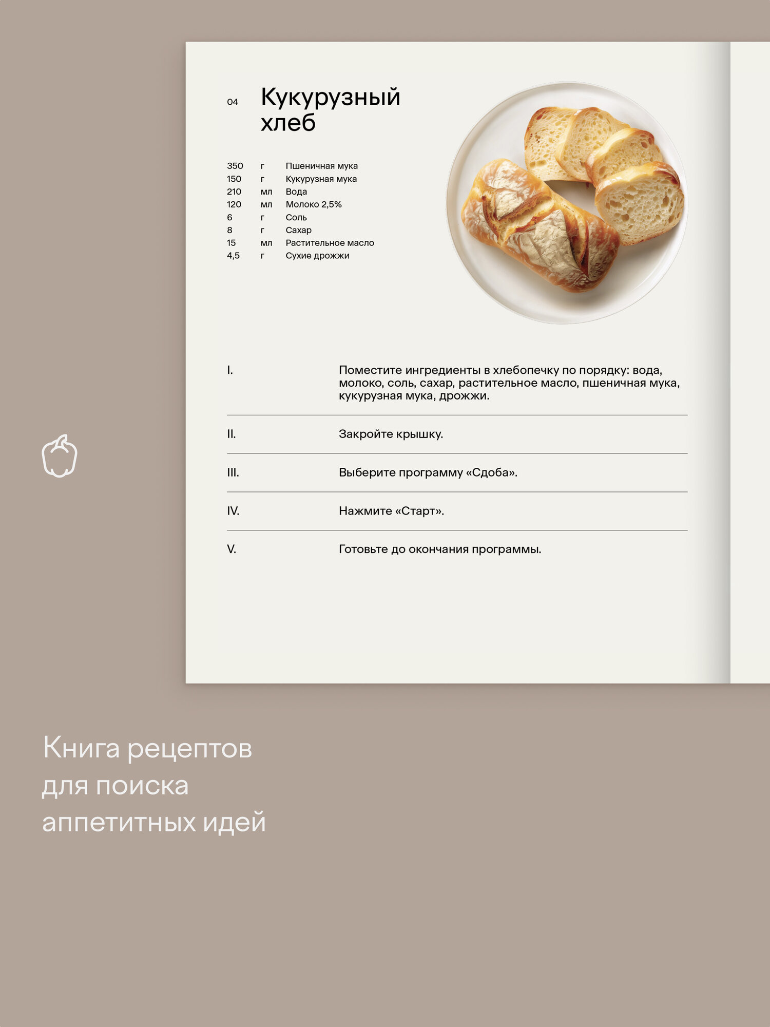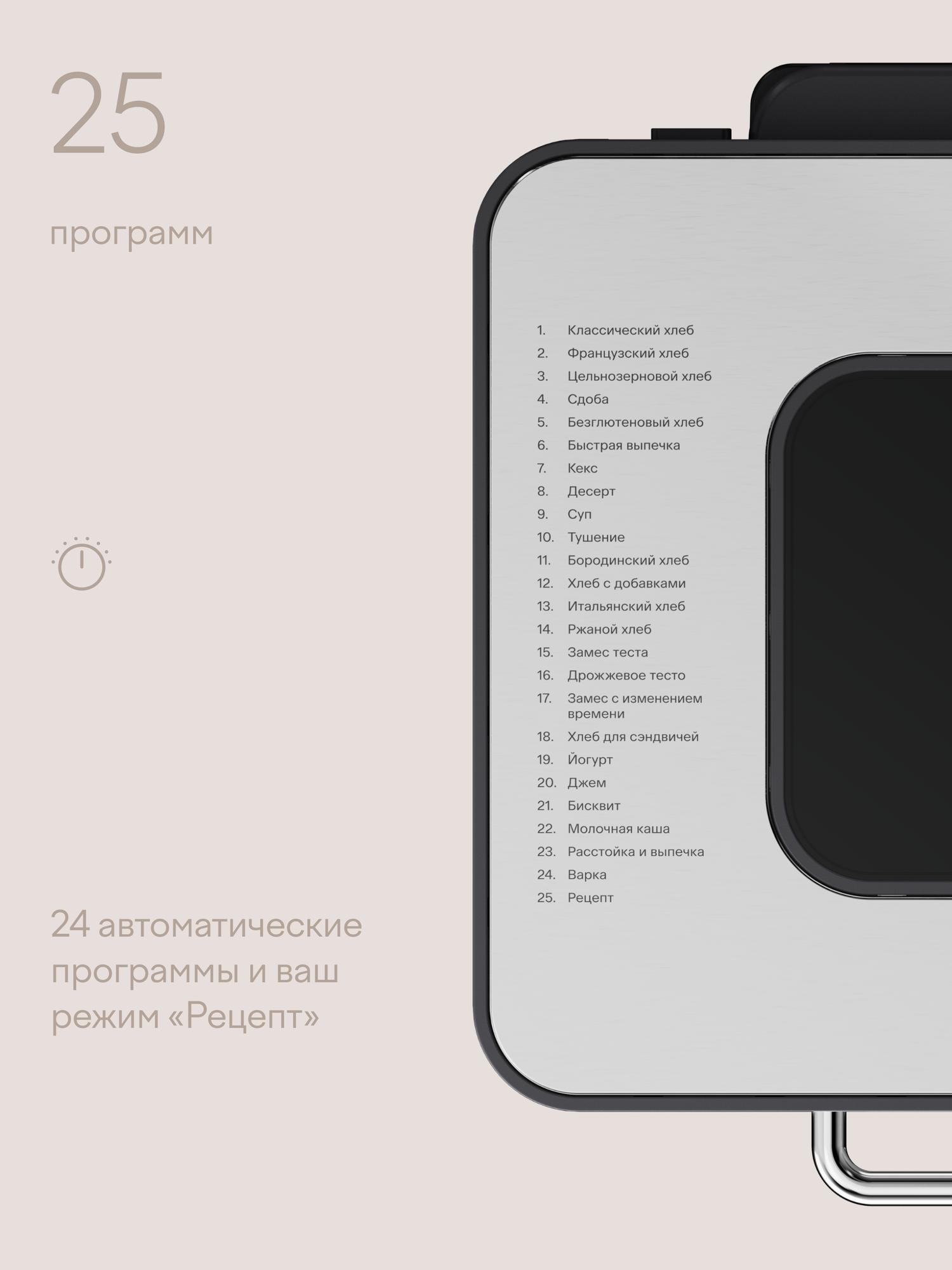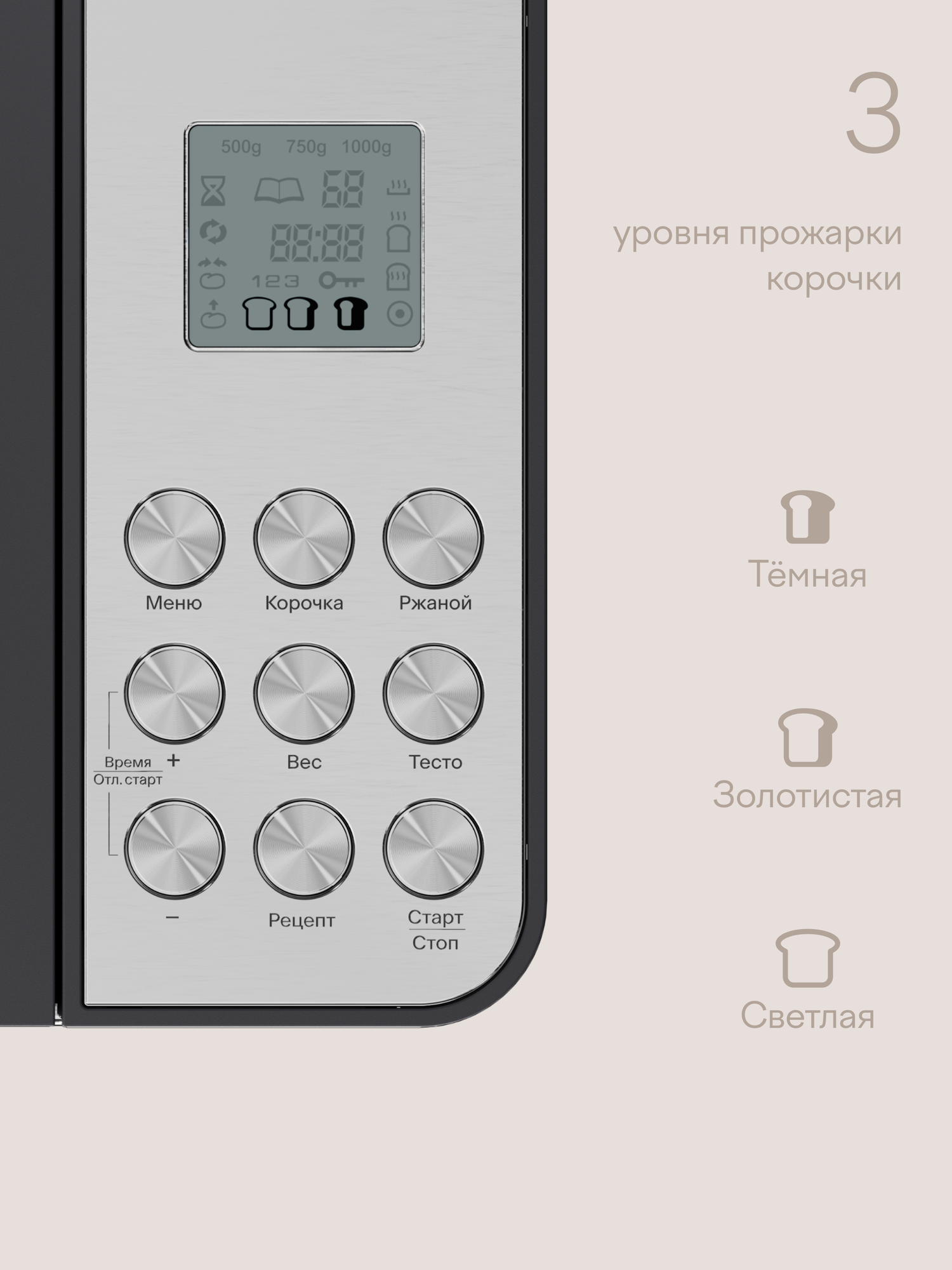 | Программы | безглютеновая выпечка / бездрожжевая выпечка / бородинский хлеб / варенье / замес теста / йогурт / кекс / пшеничный хлеб / ржаной хлеб / сладкая выпечка / французский багет / хлеб из муки грубого помола |