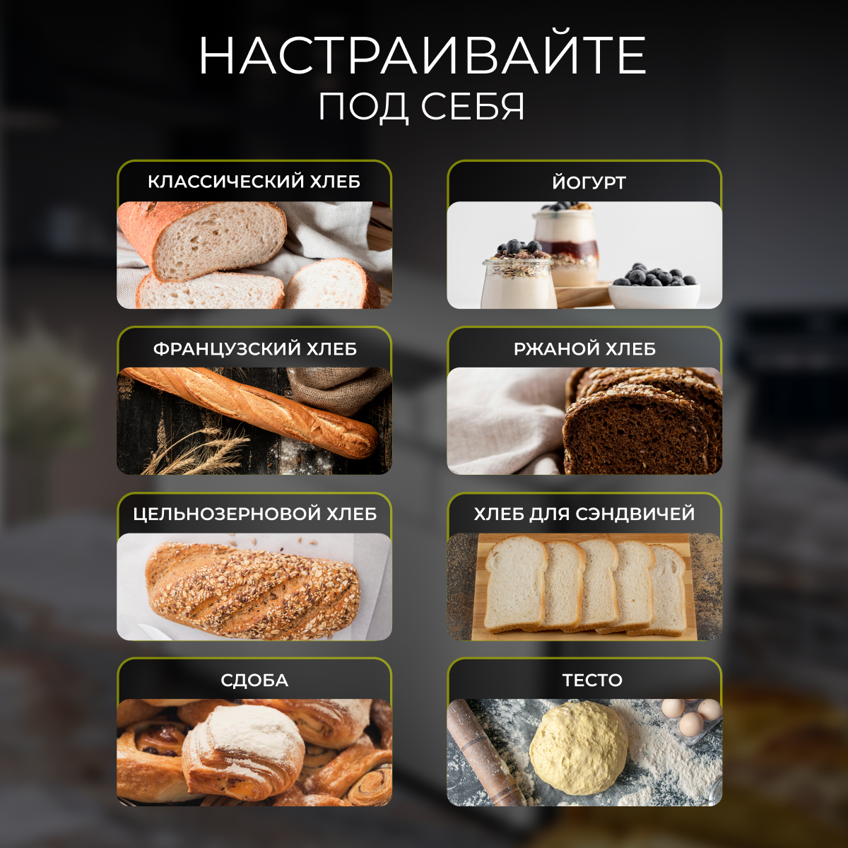 | Программы | безглютеновая выпечка / бездрожжевая выпечка / бородинский хлеб / варенье / замес теста / йогурт / кекс / пшеничный хлеб / ржаной хлеб / сладкая выпечка / французский багет |