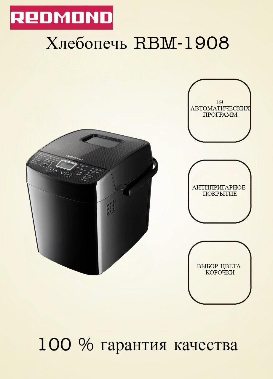 Хлебопечка REDMOND RBM-1908, 19 автоматических программ, мощность 450Вт, черный цвет интересное: